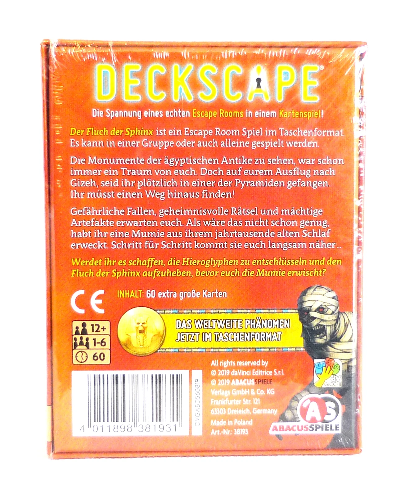 Der Fluch der Sphinx ist ein Escape Room Spiel im Taschenformat. Es kann in der einer Gruppe oder auch alleine gespielt werden.