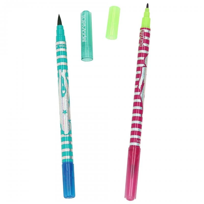 Die Doppelfasermaler haben eine weiche Pinselspitze (0,5-2 mm) auf der einen Seite und eine feste, dünne Spitze (0,5 mm) auf der anderen Seite.