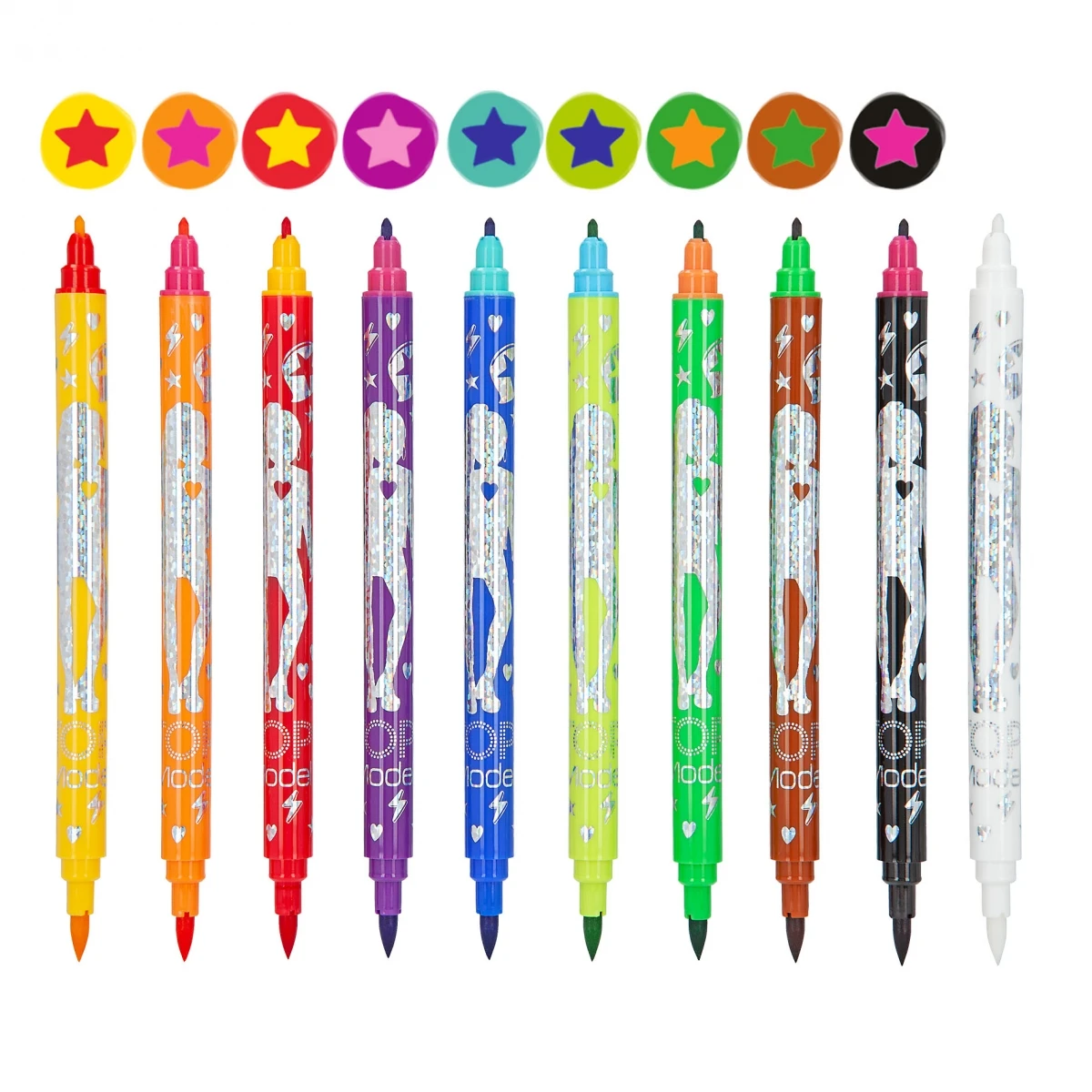 Die Doppelfasermaler haben eine weiche Pinselspitze (0,5-2 mm) auf der einen Seite und eine feste, dünne Spitze (0,5 mm) auf der anderen Seite.