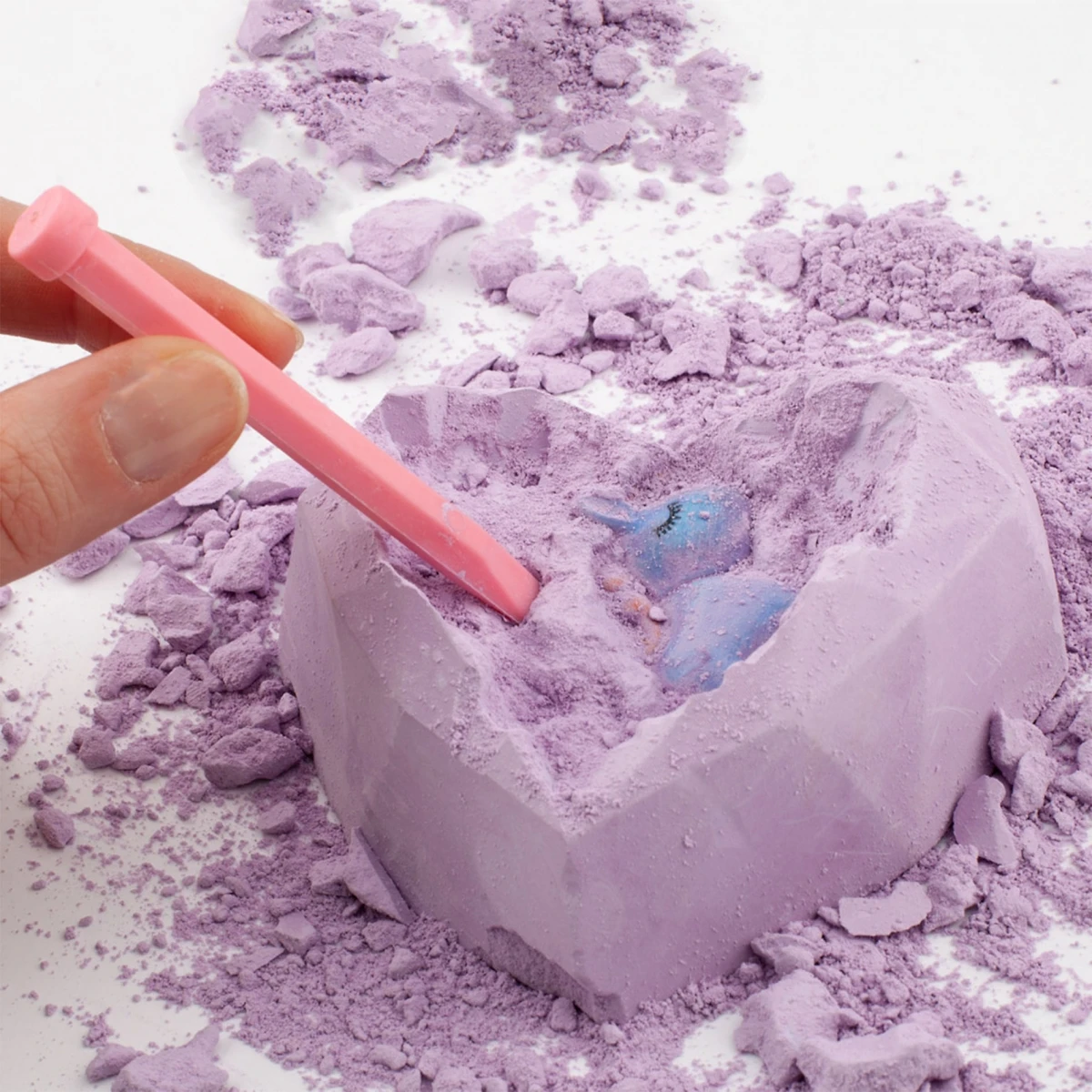 In dem Gipsherz befindet sich ein Einhorn-Radierer, der erst durch den Einsatz des Hammers, Meißels und Pinsels zum Vorschein kommt.