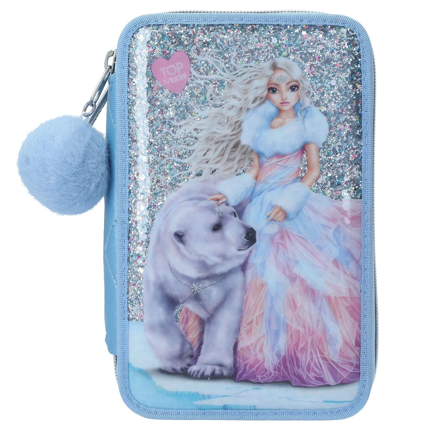 Die polarblaue Federtasche aus der TOPModel-Serie ICEWORLD ist mit der glitzernden Front und dem großen Model-Eisbär-Motiv ein echter Hingucker.