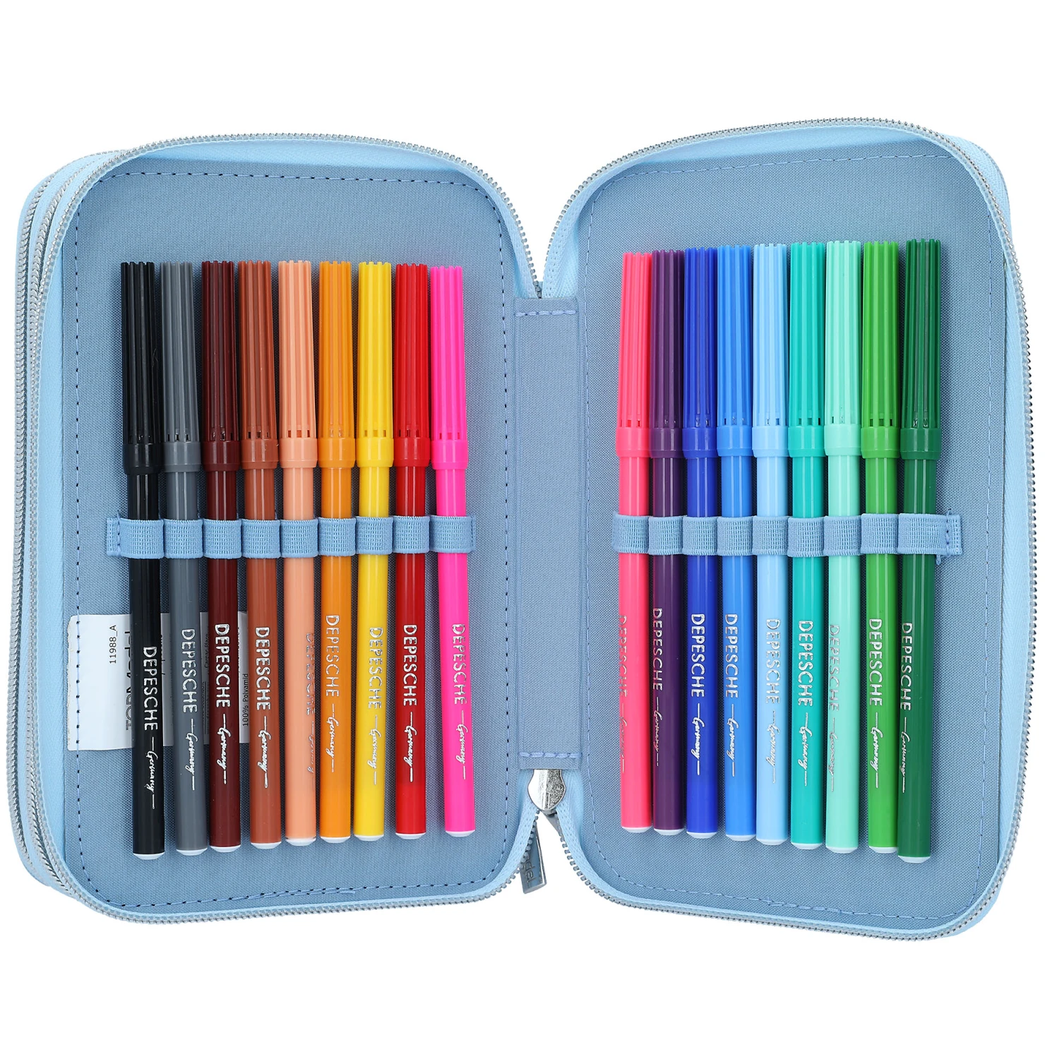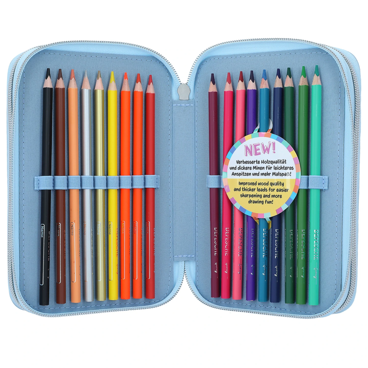 Die drei separaten Fächer sind komplett gefüllt mit 18 Filzstiften, 18 Buntstiften (Neu: verbesserte Holzqualität und dickere, stabilere Mine), 2 Bleistiften, Radierer, Anspitzer, Lineal, Schere, Klebestift und einem kleinen Klettverschluss-Täschchen.