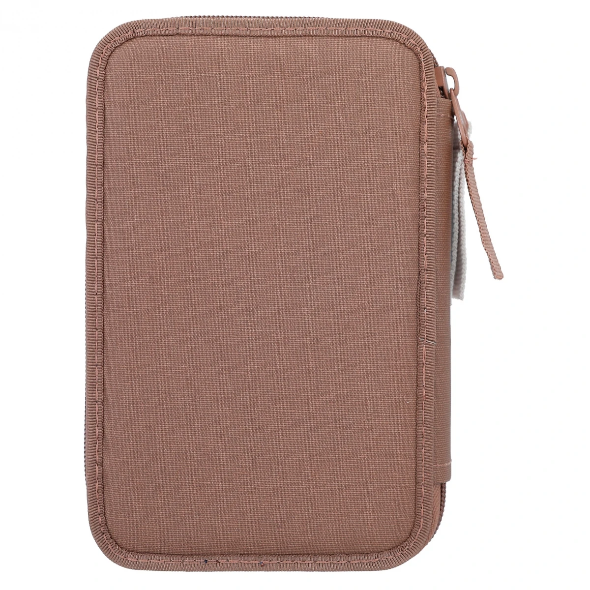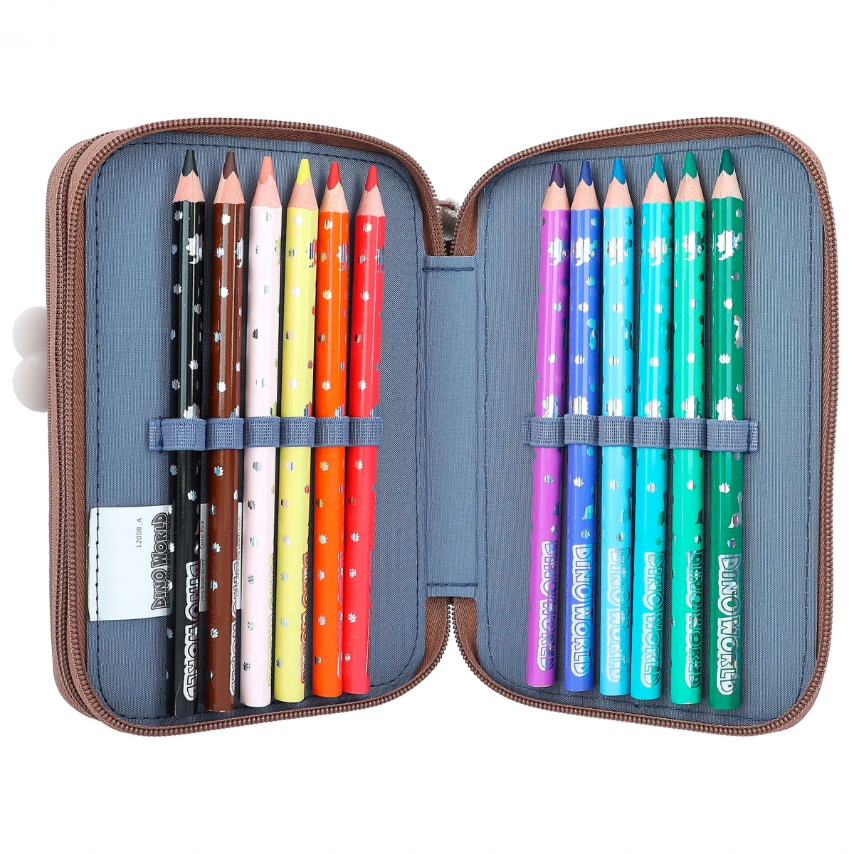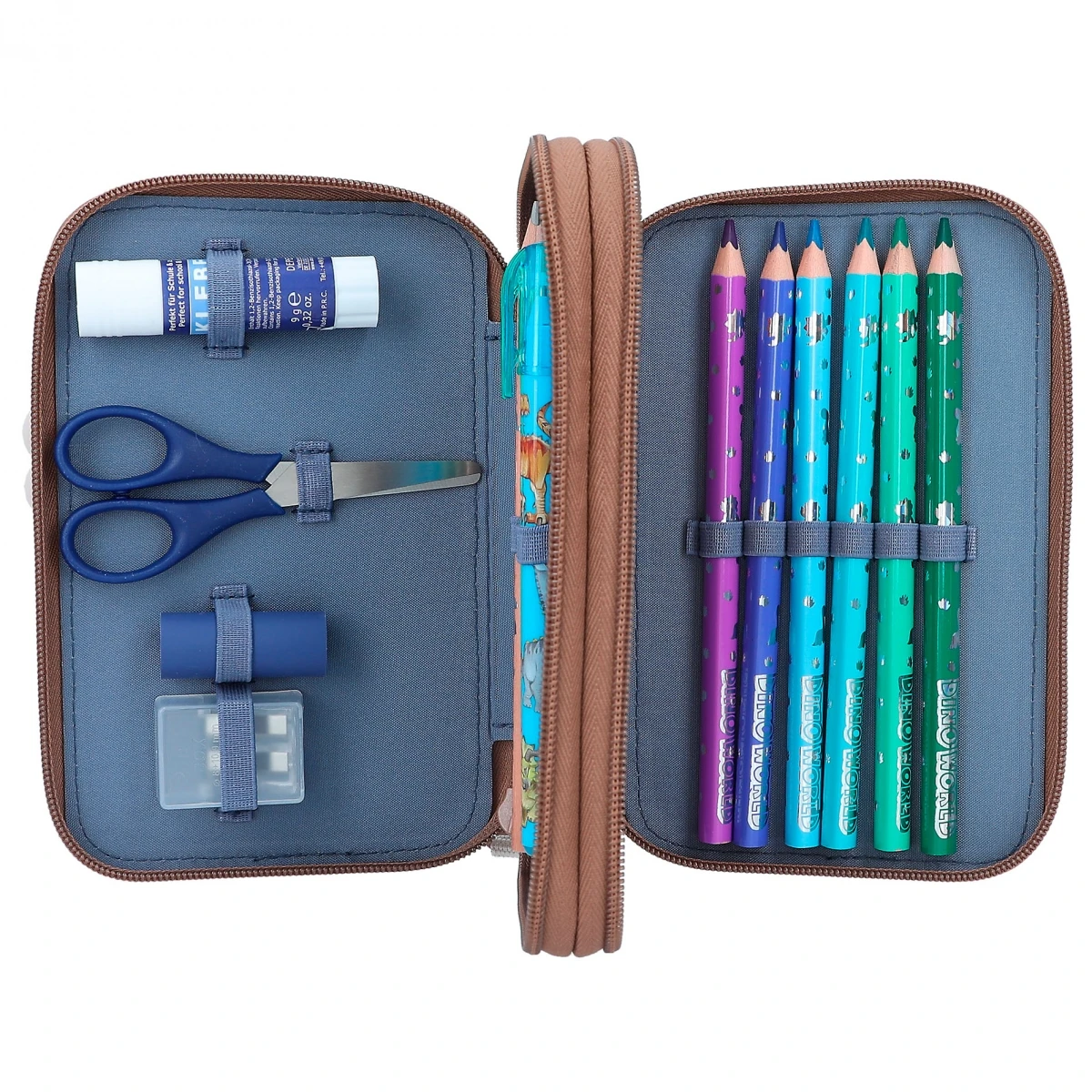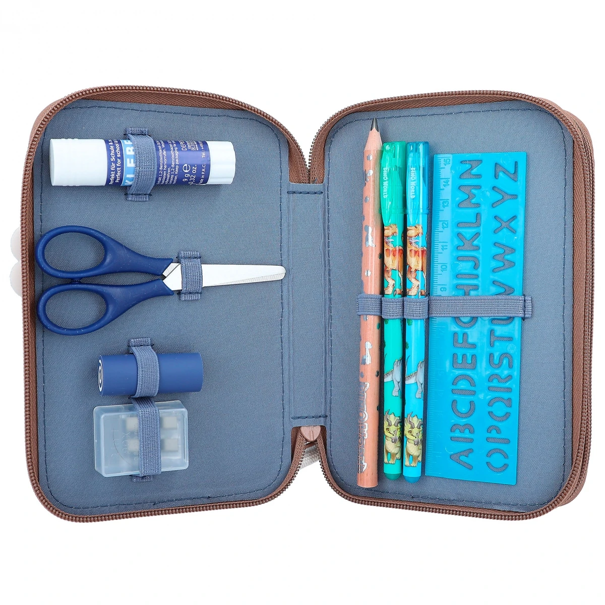 Die braune Federtasche aus der Serie Dino World Mini hat einen niedlichen aufgesetzten grünen Frottee-Dino auf der Front, vor dessen Maul ein lustiger Knochen-Anhänger baumelt.