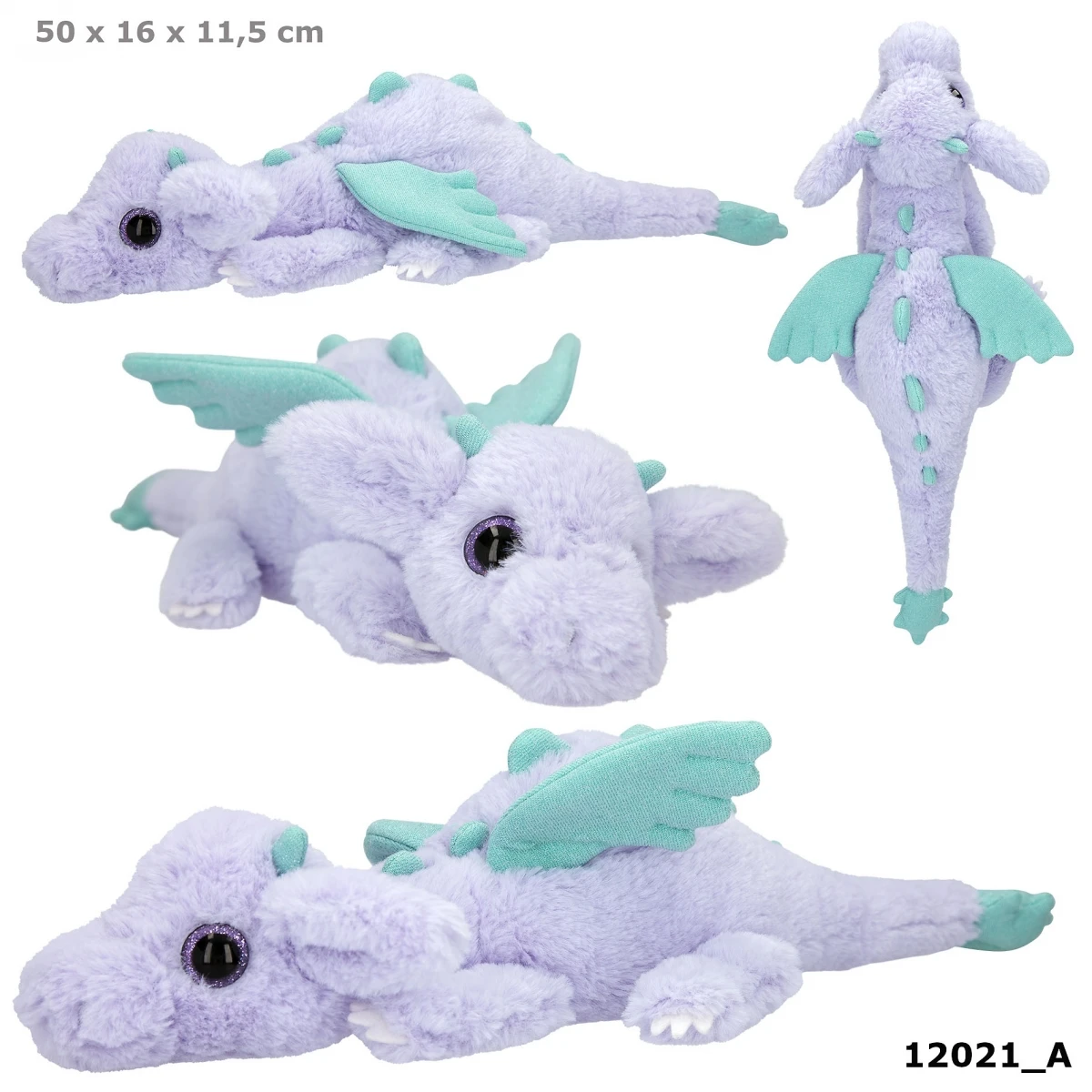 Der lilane Plüschdrache von TOPModel hat türkise Glitzerflügel und lilafarbene Glitzeraugen aus Kunststoff.