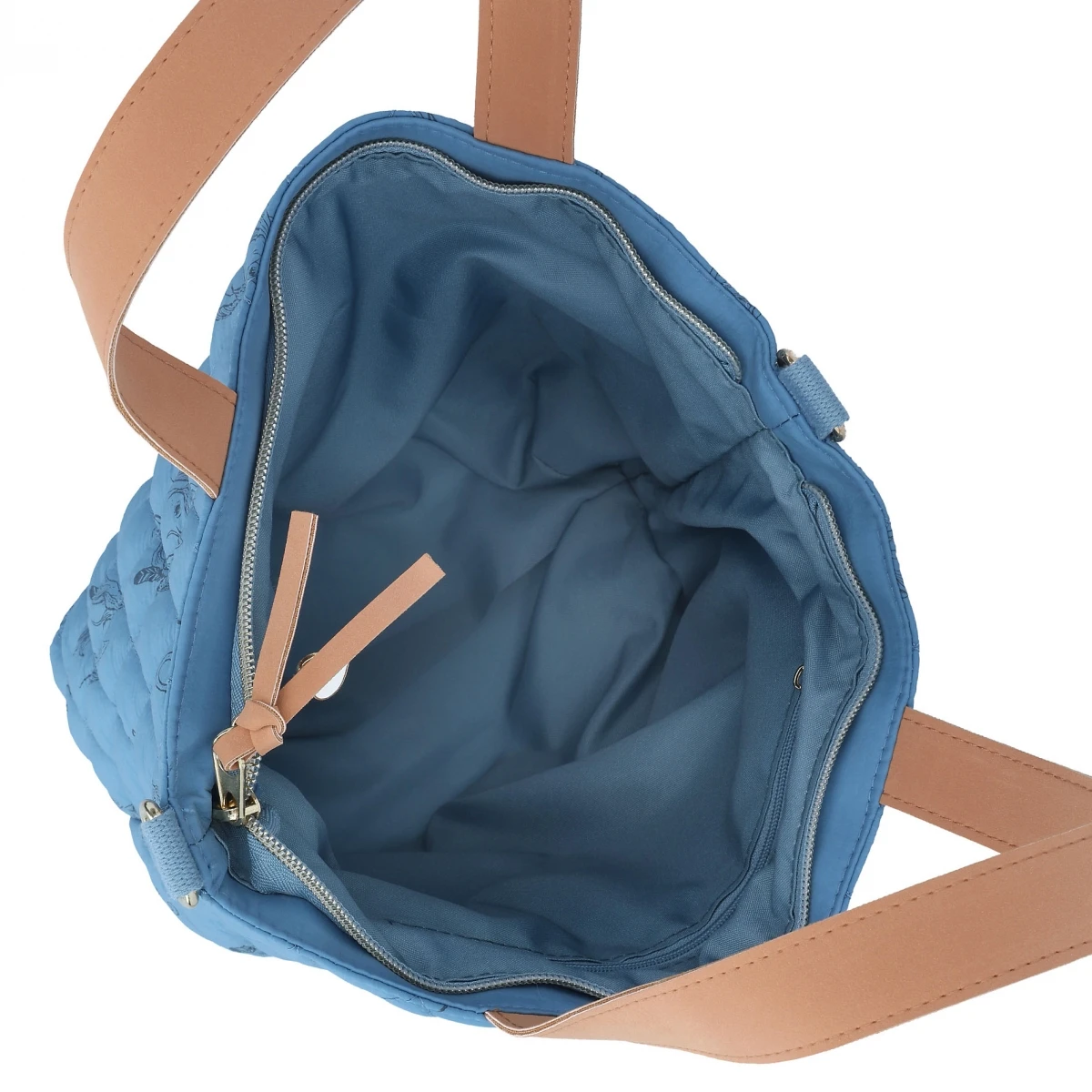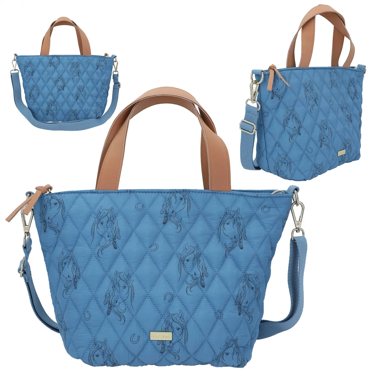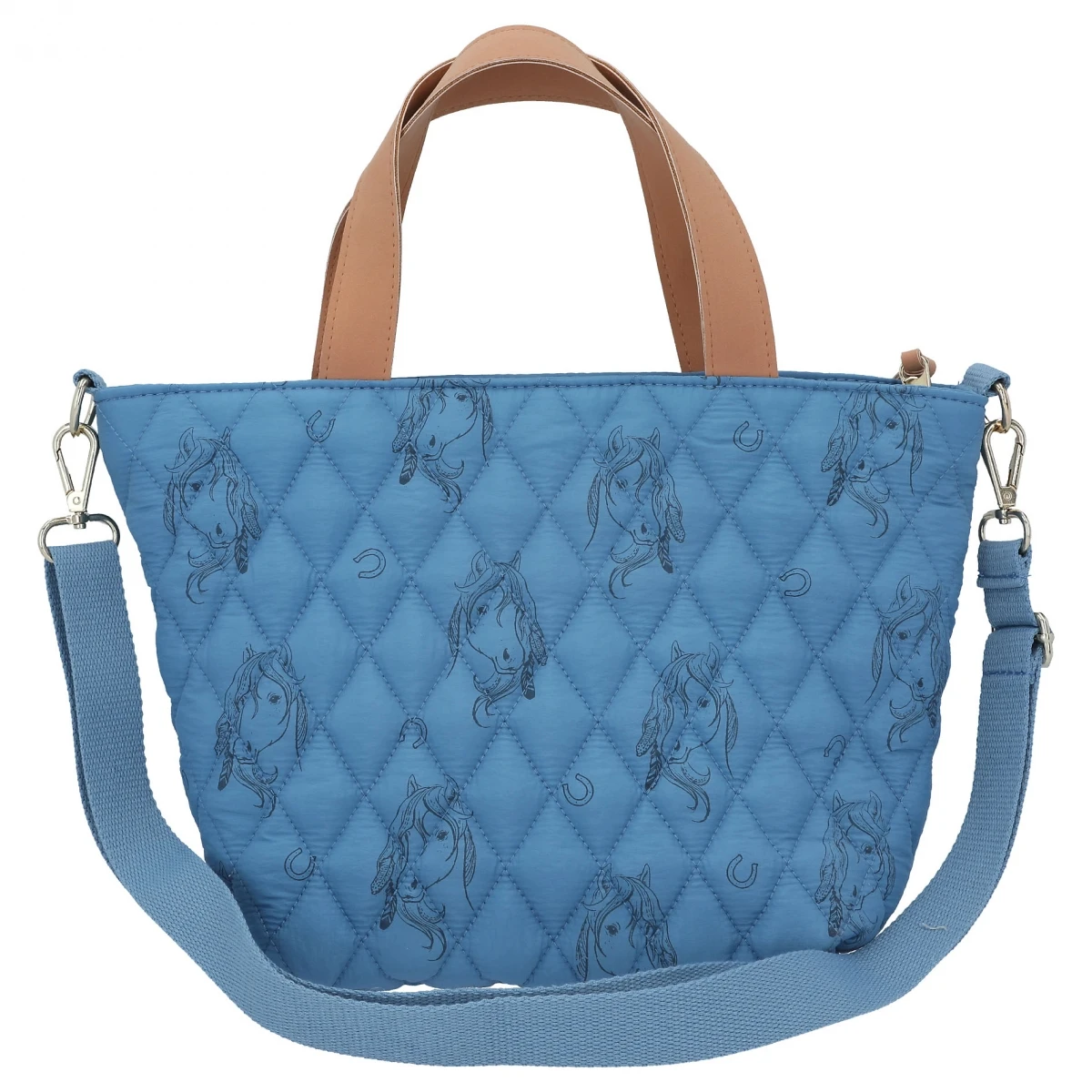 Die kleine blassblaue Shopper-Tasche von Miss Melody hat eine angesagte Steppung und einen niedlichen Allover-Druck aus Pferde-Köpfen und Hufeisen.