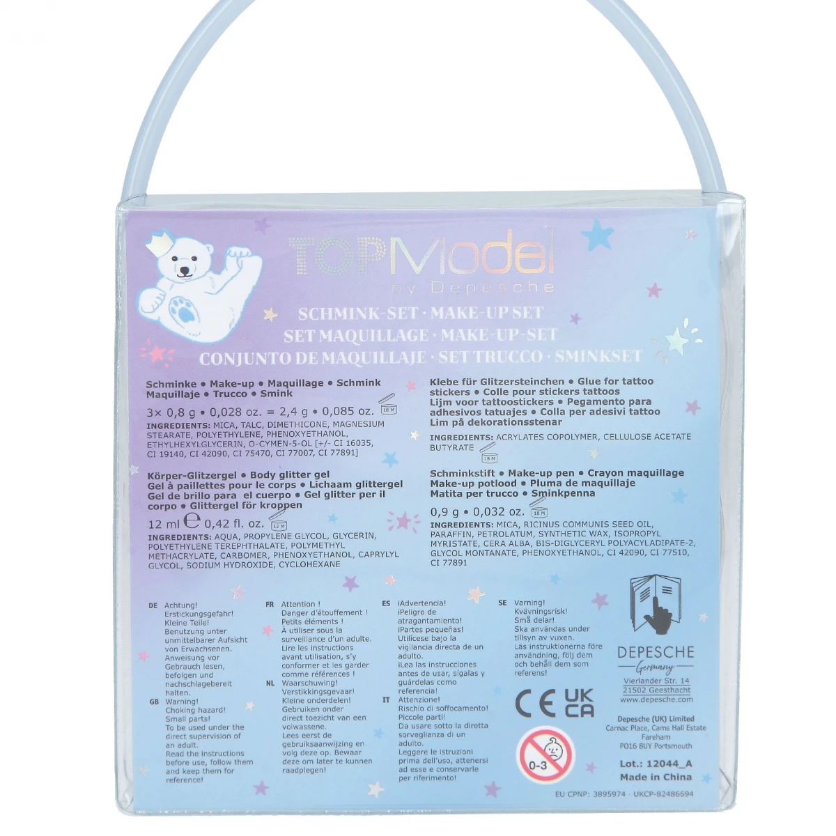 Das TOPModel-Schminkset ICEWORLD im transparenten Täschchen enthält 1 Glitzergel (12 ml), 1 blauen Schminkstift (0,9 g), Make-up in Rosa, Türkis und Blau (3 x 0,8 g) mit passendem Pinsel zum Auftragen, 14 Dekostein-Sticker für die Haut (Pink und Silber) sowie eine Schmink-Schablone.