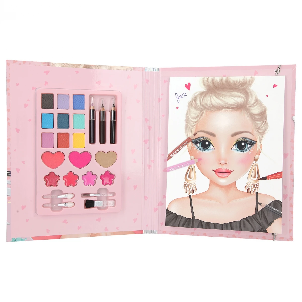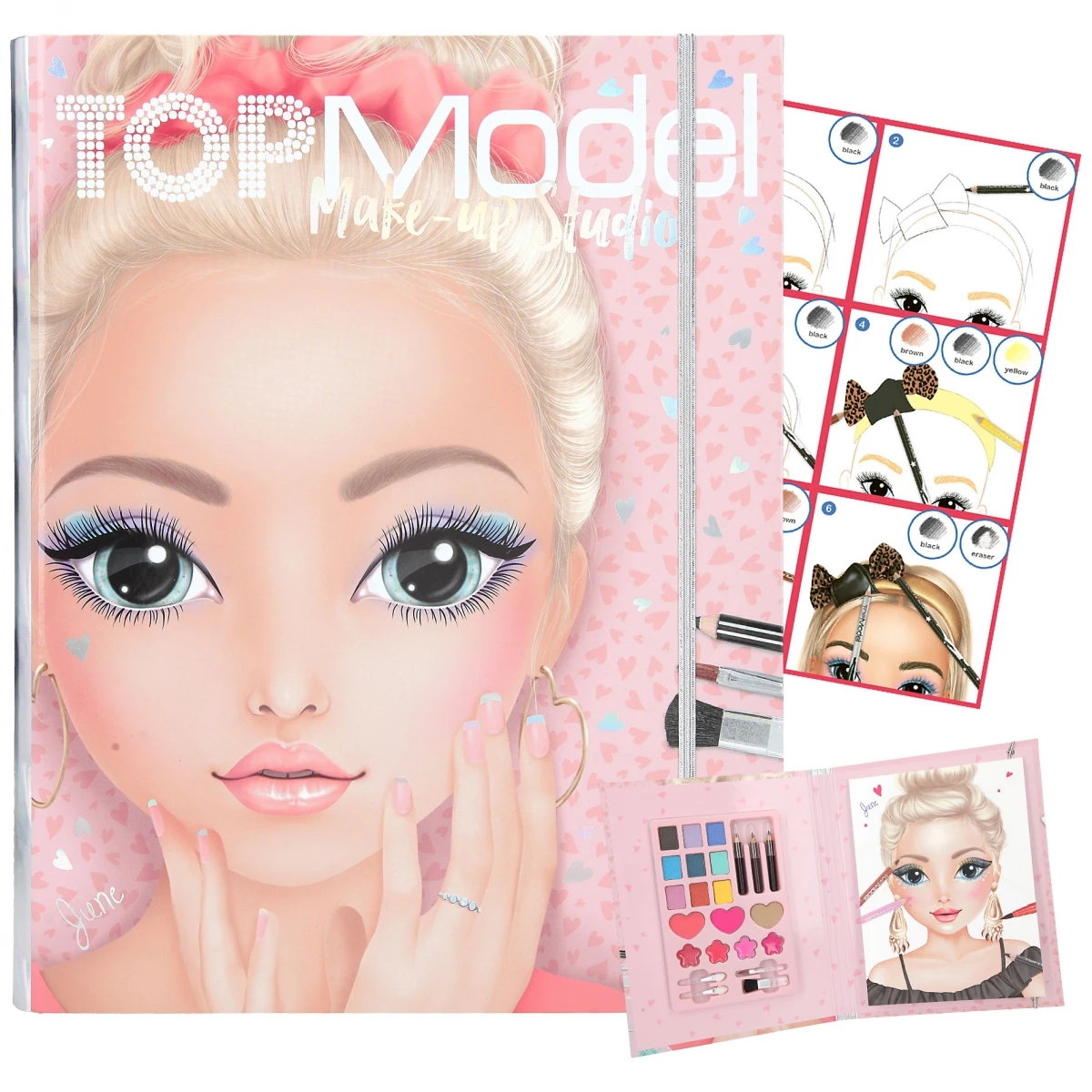TOPModel Make-up Studio: In dieser Mappe kann man all seine Schmink-Ideen ausprobieren! Mit dabei: Ein Block mit TOPModel-Gesichtern zum Ausmalen sowie eine Schmink-Palette mit 9-mal Lidschatten (je 0,8 g), 3-mal Rouge (je 2,5 g), 4-mal Lipgloss (je 0,6 g), 3-mal Eyeliner (je 0,7 g) und 4 Pinseln.