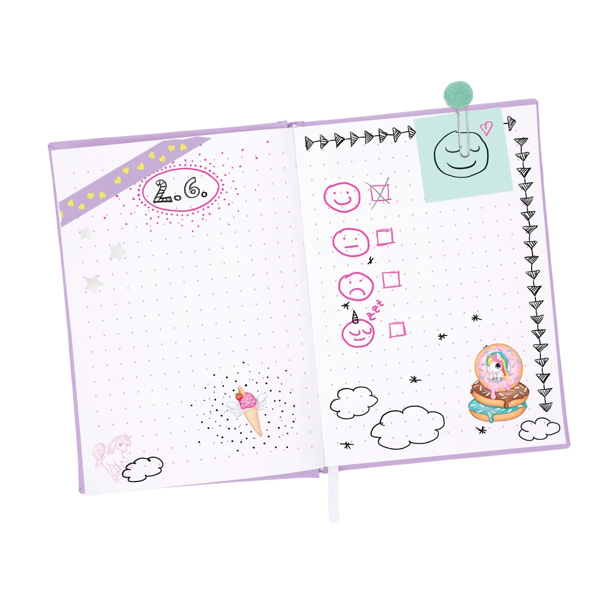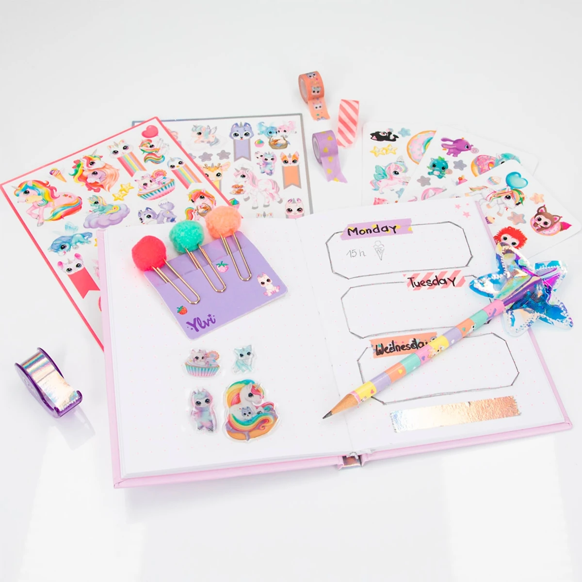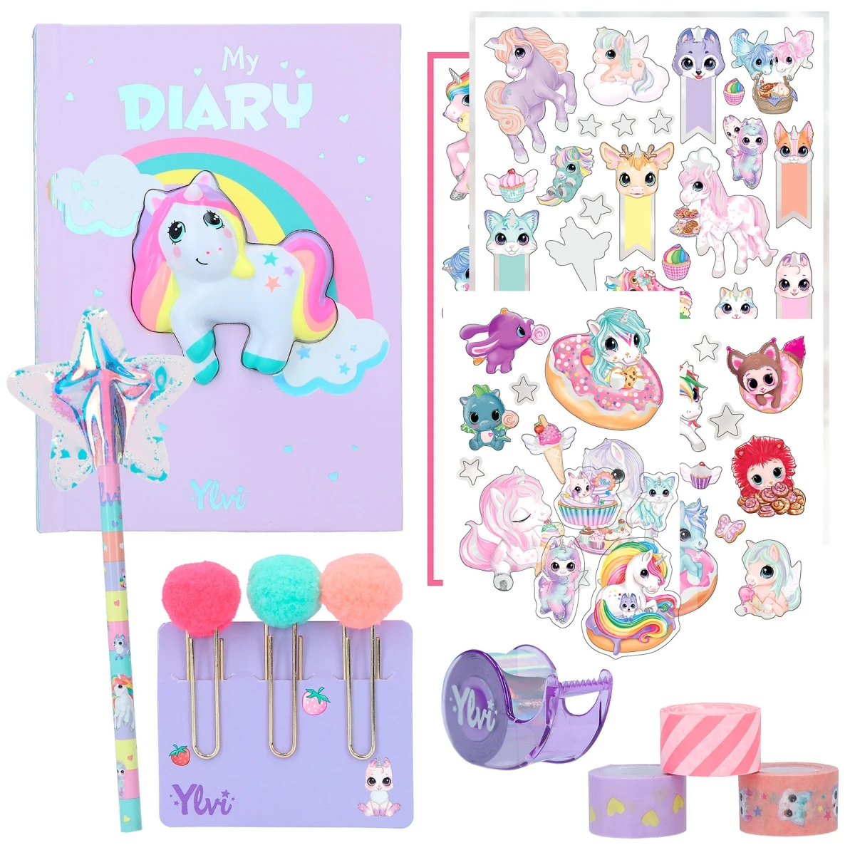 Zum Set von Ylvi gehören ein innen fein gepunktetes Notitzbuch, 3 Heftklammern mit süßen Bommeln, 1 Bleistift mit Stern-Topper, 1 Abroller mit 4 Deko-Tapes sowie viele niedliche Sticker aus der zauberhaften Welt von Einhorn Naya.