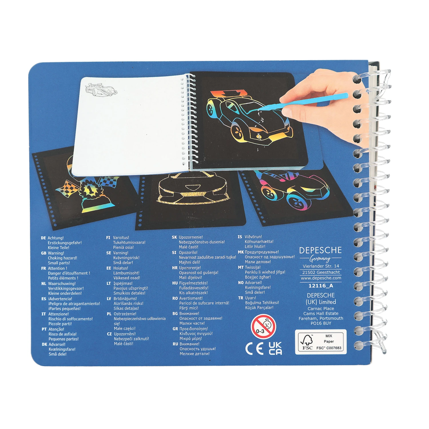 20 spiralgebundene schwarze Seiten hinter denen sich coole Motive aus der Welt der schnellen Autos verbergen.