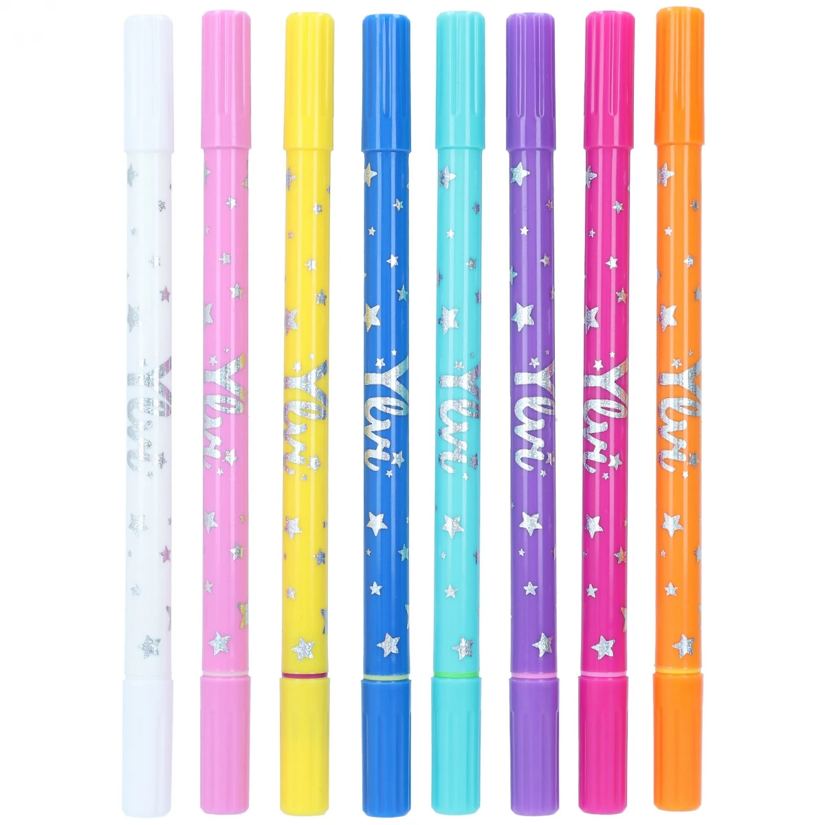 Mit dabei: 7 bunte Doppelfasermaler (1 breite Spitze 0,5×3 mm, 1 dünne Spitze 1 mm) sowie ein Magic-Stift, der die gemalten Farben wie von Zauberhand verändert: aus 7 Farben werden so 14 Farben!
