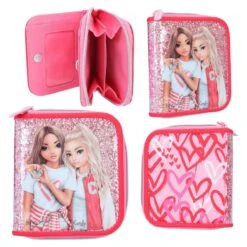 Das Portemonnaie in tollen Rot- und Rosatönen hat eine echte Hingucker-Front mit viel Glitzer und einem stylishen Model-Print sowie niedliche Herzen auf der Rückseite.
