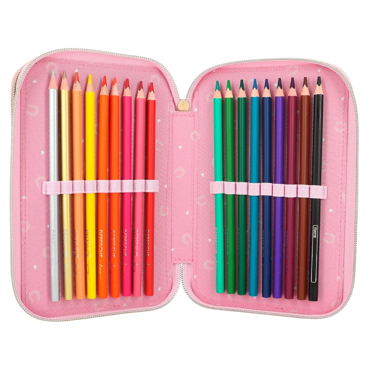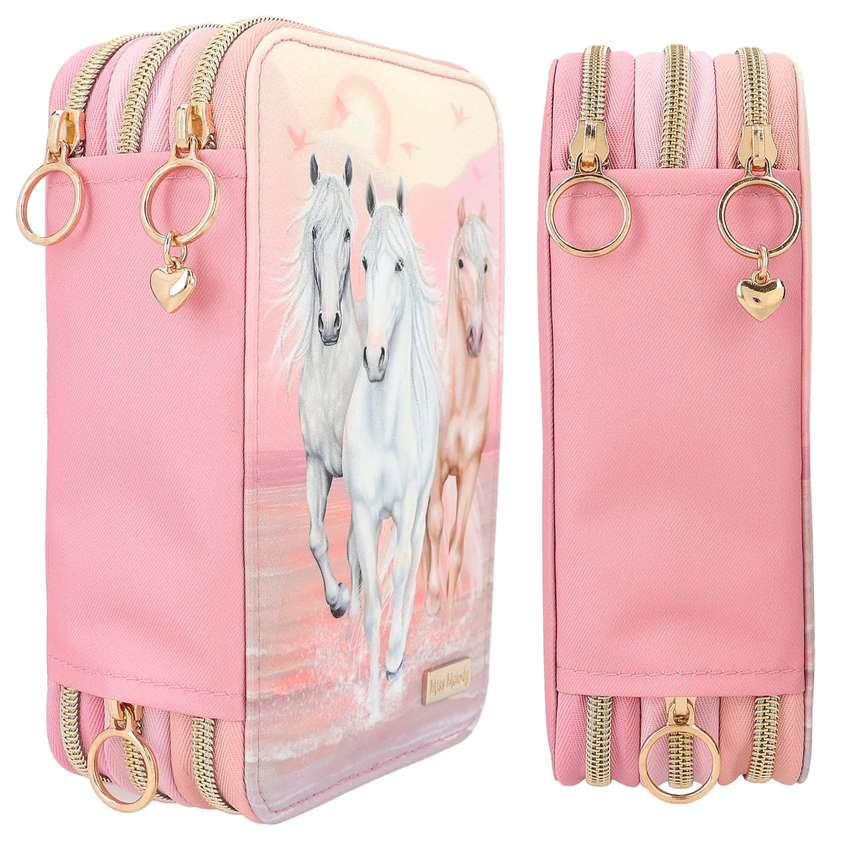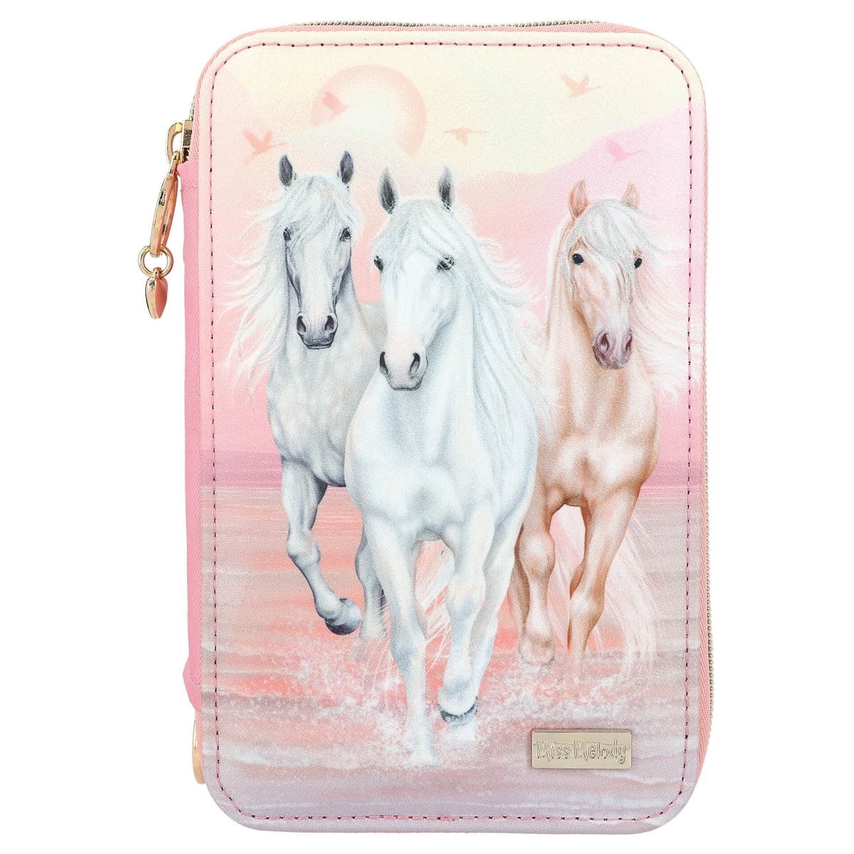 Die Federtasche Sundown von Miss Melody ist nicht nur außen wunderschön, sondern auch innen komplett gefüllt mit je 18 Bunt- und Filzstiften, 2 Bleistiften, Lineal, Radierer, Anspitzer, Schere, Klebestift und einer kleinen Klett-Tasche.