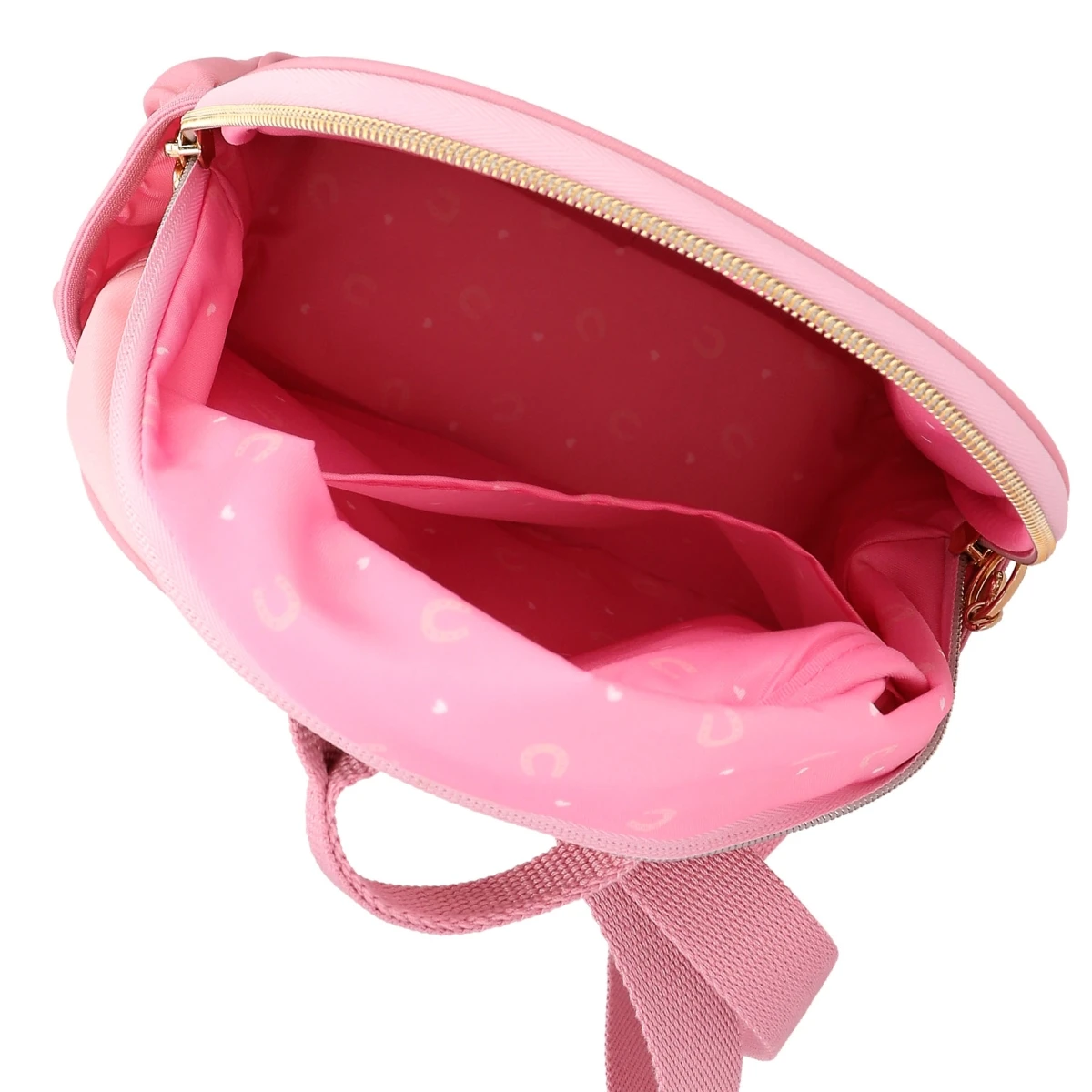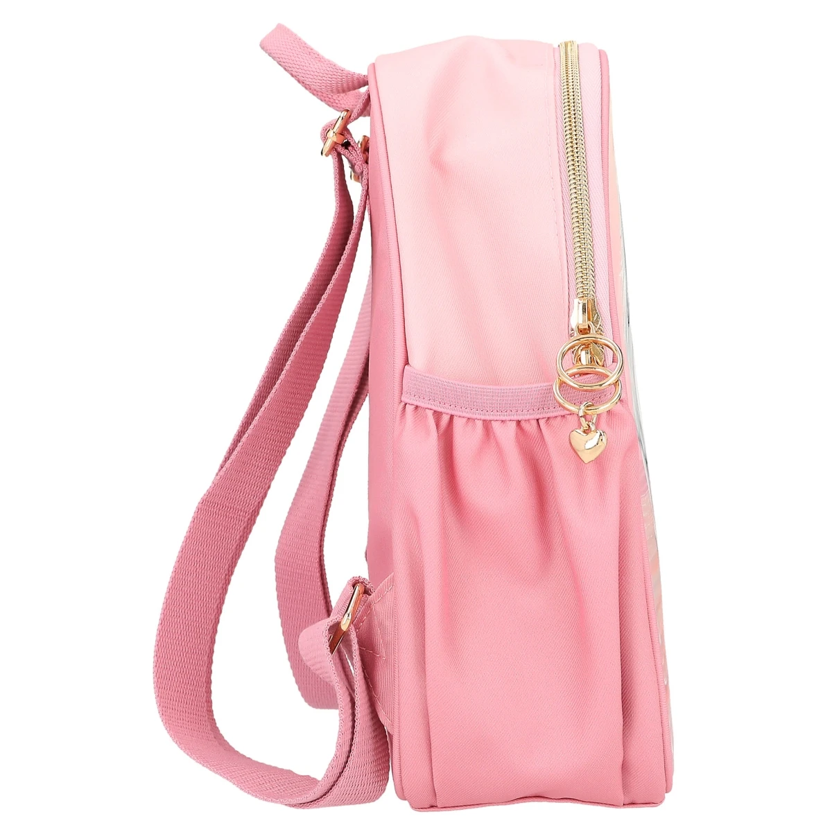 Der Rucksack Sundown von Miss Melody mit geräumigem Hauptfach, extra Innenfach, Seitentaschen, Tragegriff und verstellbaren Trägern hat als süßes Plus einen goldenen Metallring mit Herzanhänger.