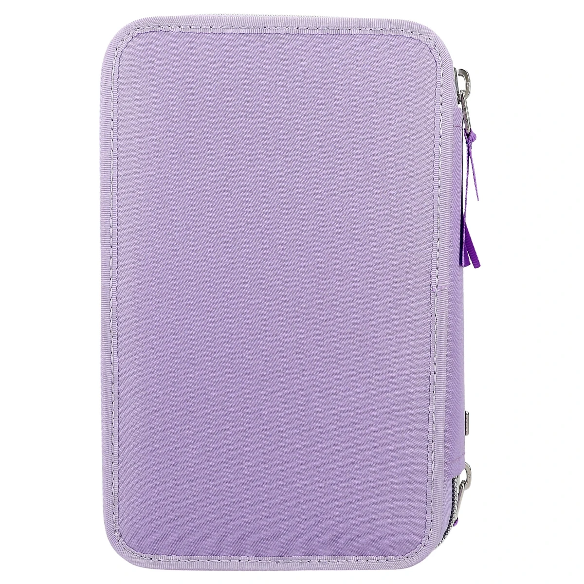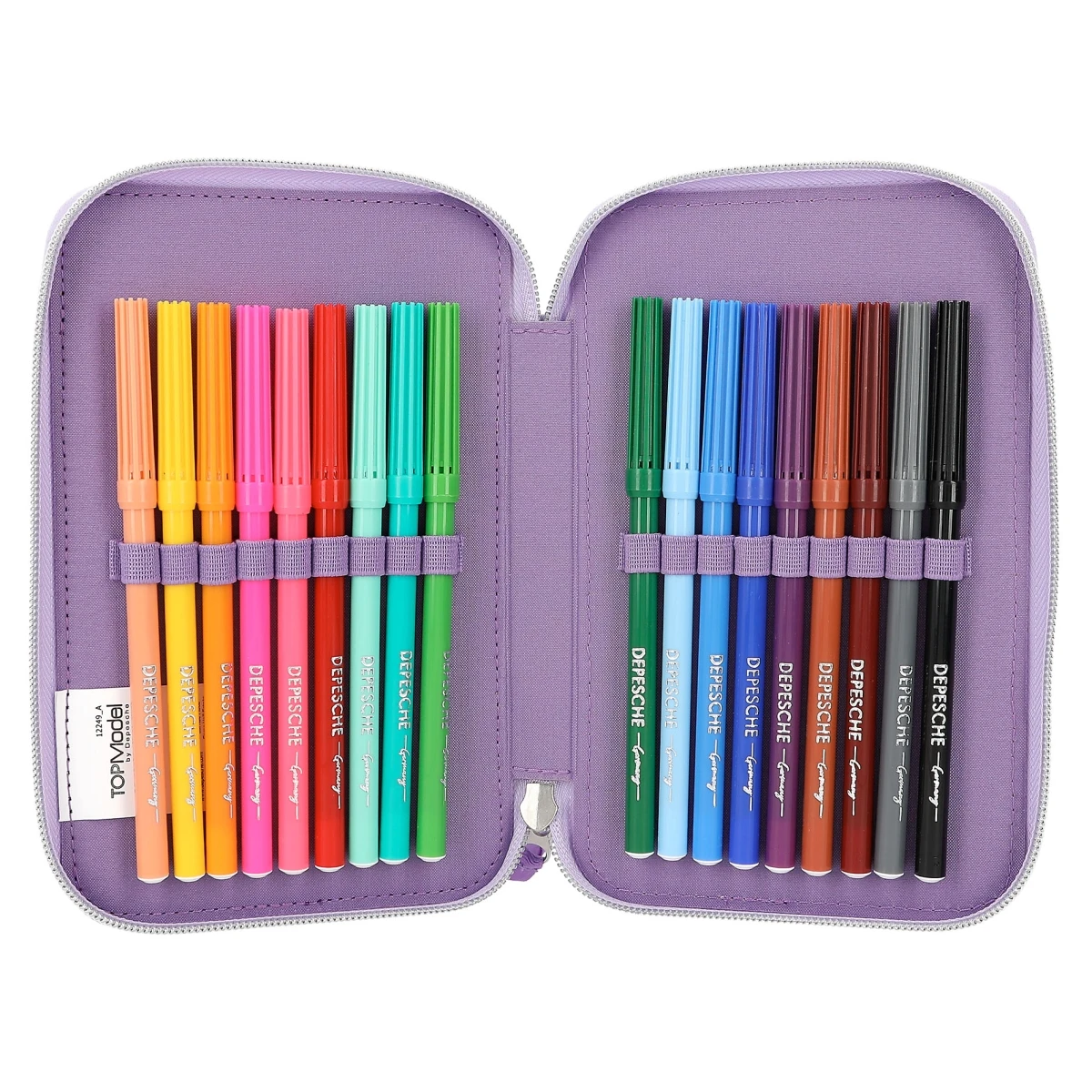 Die drei separaten Fächer sind komplett gefüllt mit je 18 Bunt- und Filzstiften, 2 Bleistiften, Lineal, Anspitzer, Radierer, Schere und Klebestift.