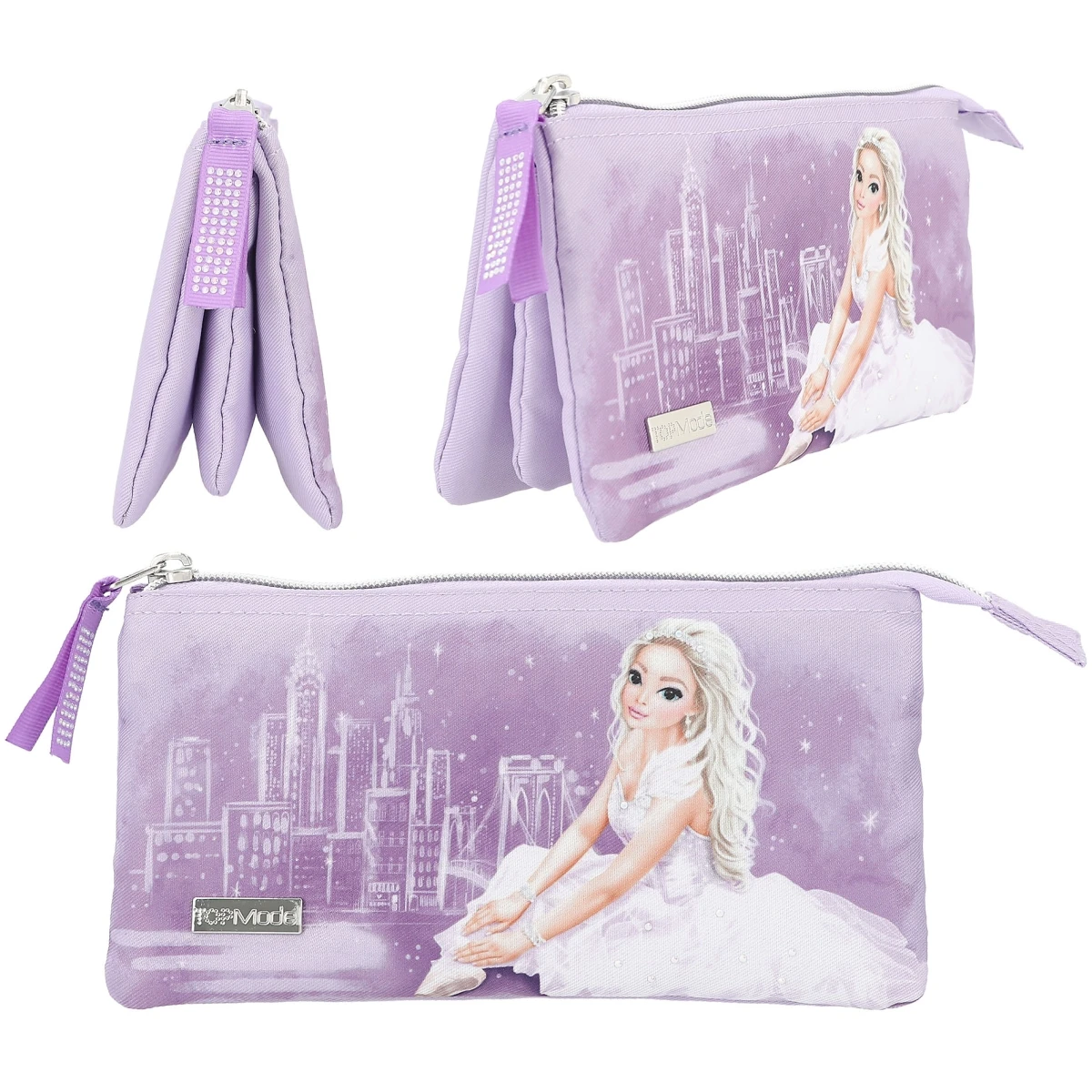 Die lila Schlampertasche mit 3 Fächern hat auf der Front eine traumhaft schöne TOPModel-Ballerina vor einer angedeuteten Skyline.