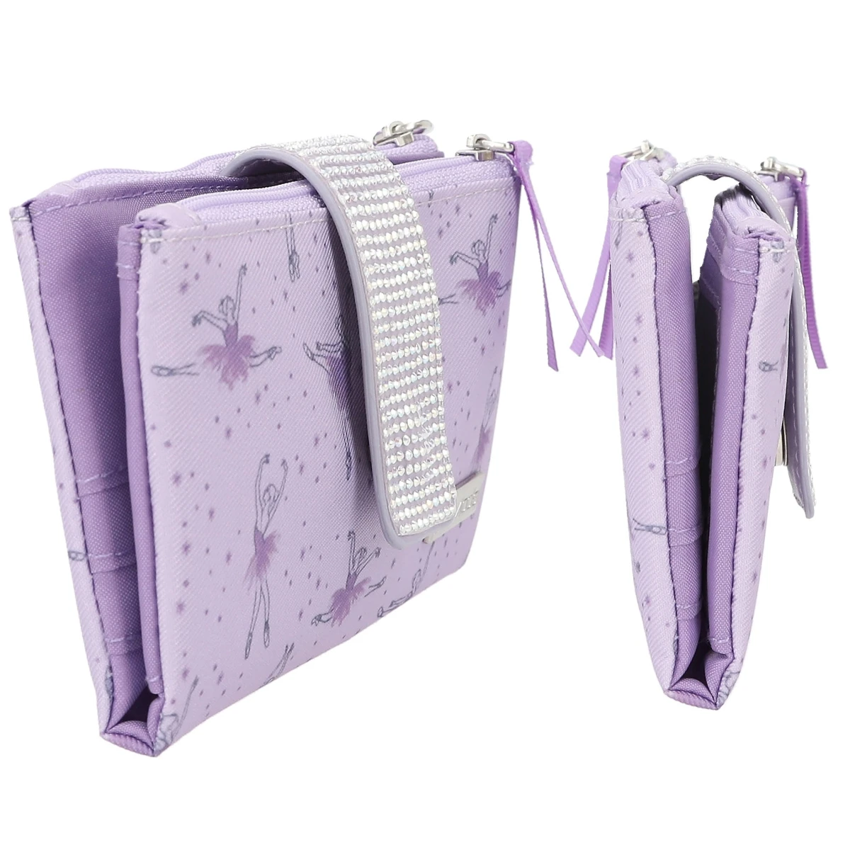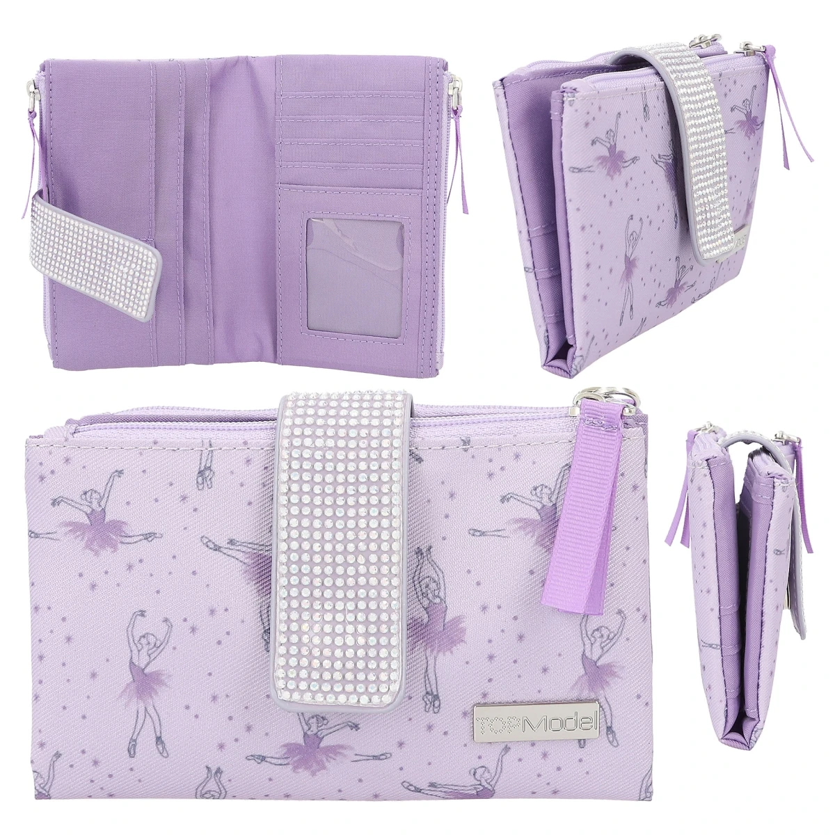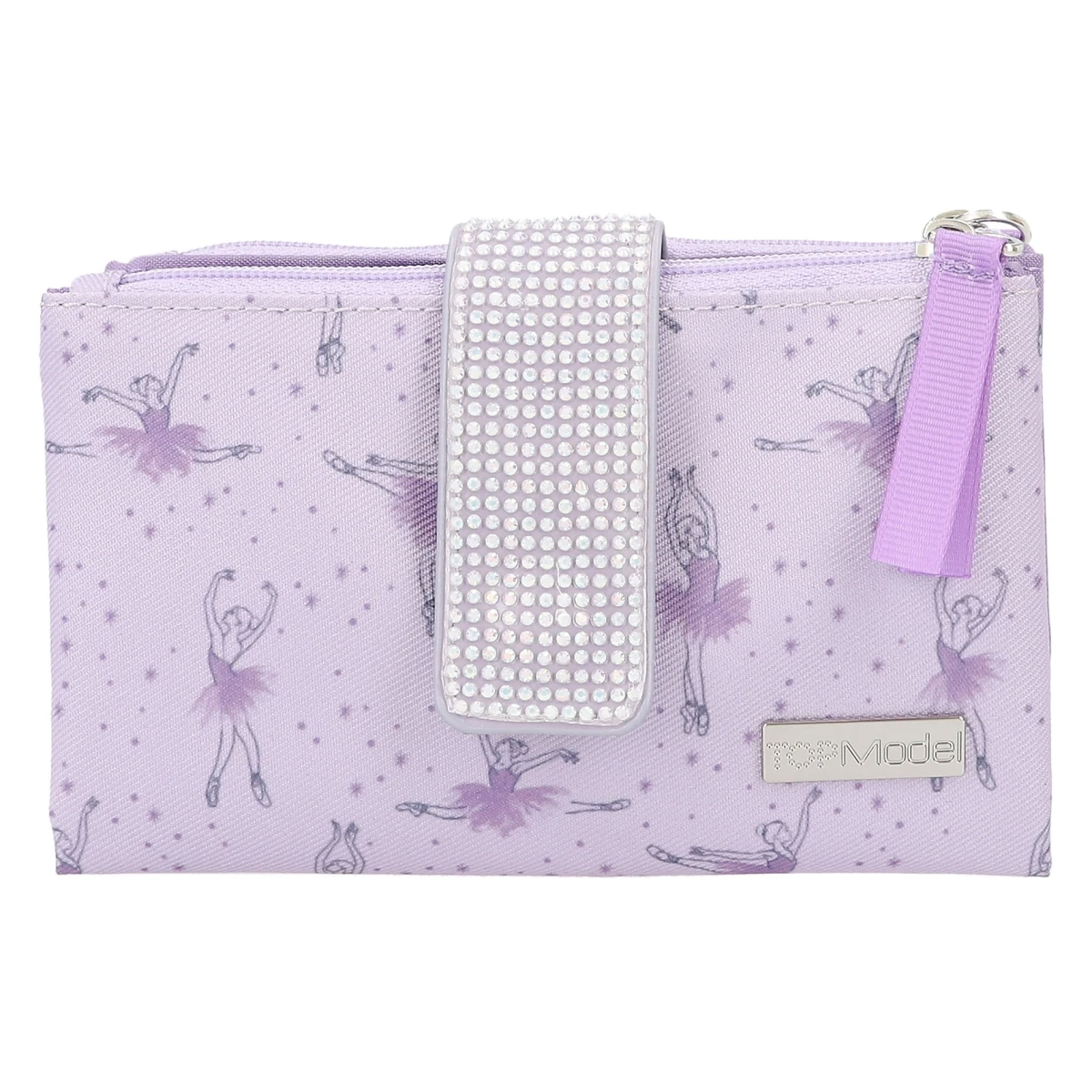 Das lila TOPModel-Portemonnaie hat außen ein supersüßes Ballerina-Allover und eine Verschluss-Lasche, die über und über mit Glitzersteinen besetzt ist.