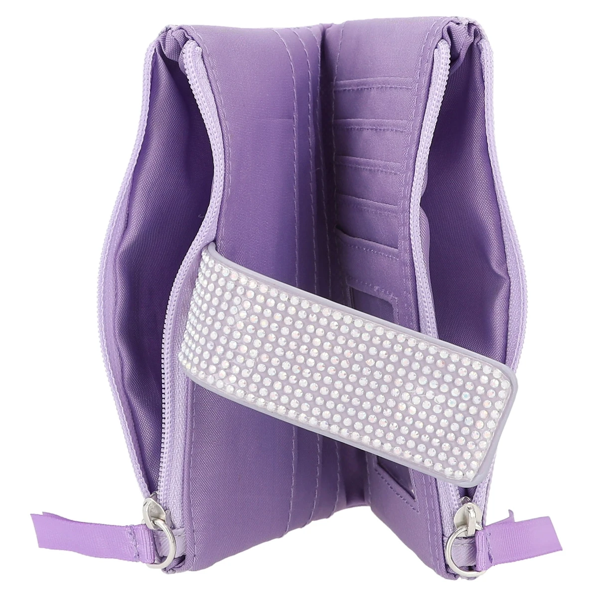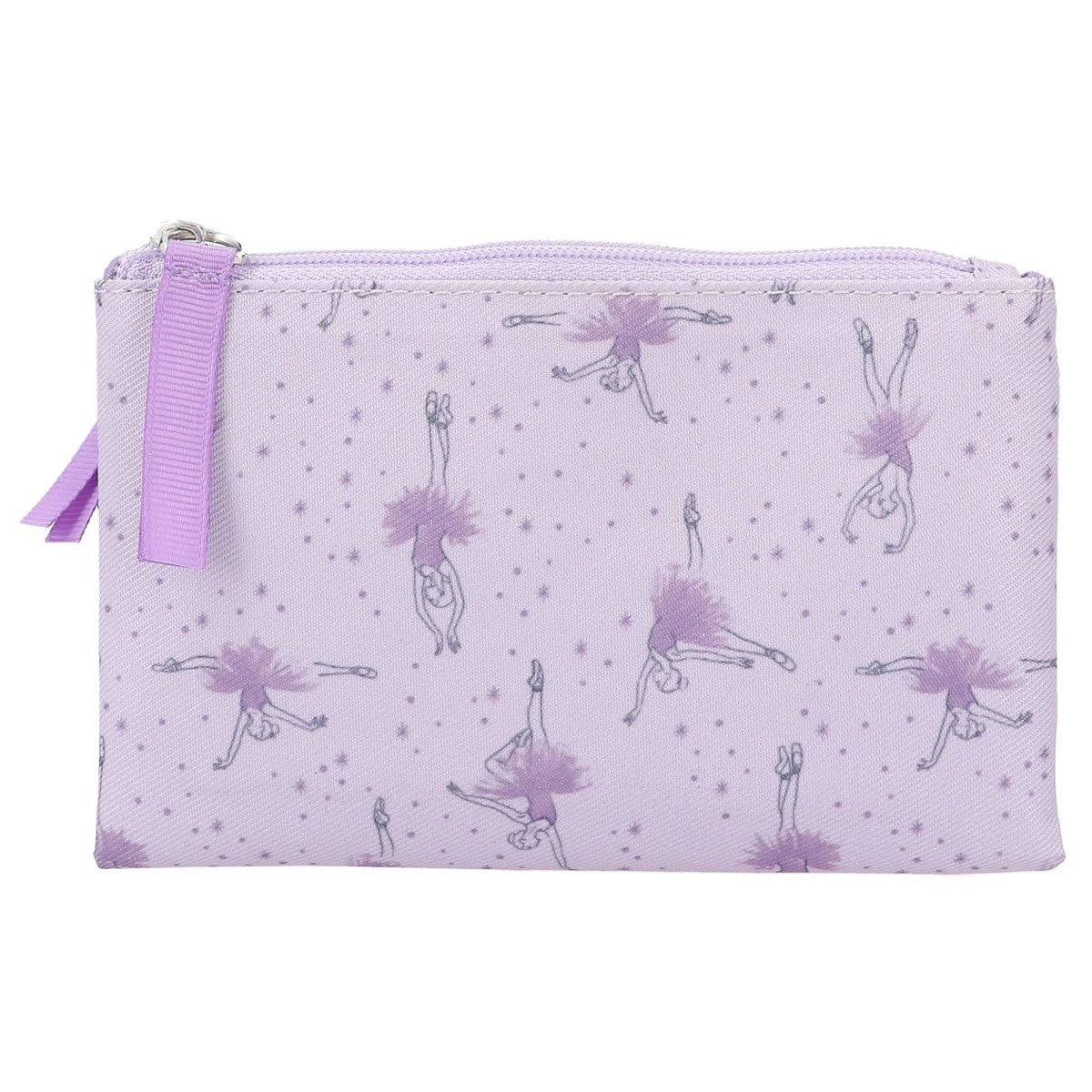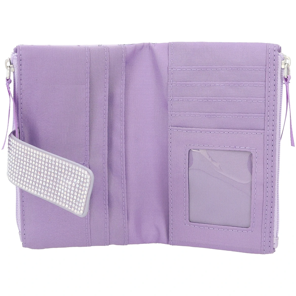 Das lila TOPModel-Portemonnaie hat außen ein supersüßes Ballerina-Allover und eine Verschluss-Lasche, die über und über mit Glitzersteinen besetzt ist.