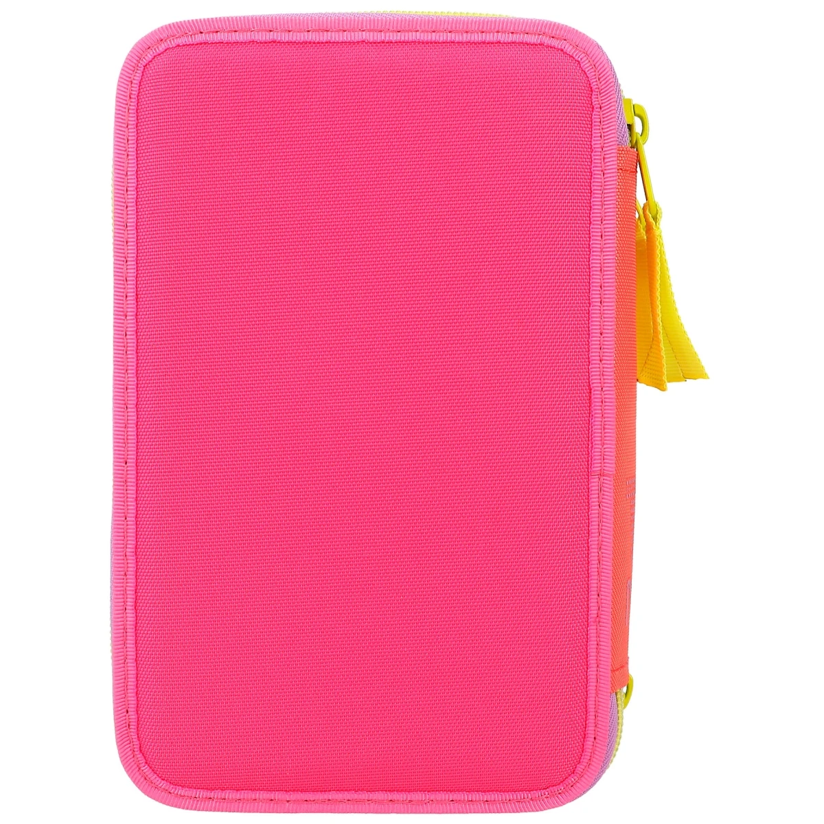 In angesagter, farbenfroher Colourblock-Optik. Die drei separaten Fächer sind komplett gefüllt mit je 18 Bunt- und Filzstiften, 2 Bleistiften, Lineal, Anspitzer, Radierer, Schere, Klebestift und einer kleinen Klett-Tasche.