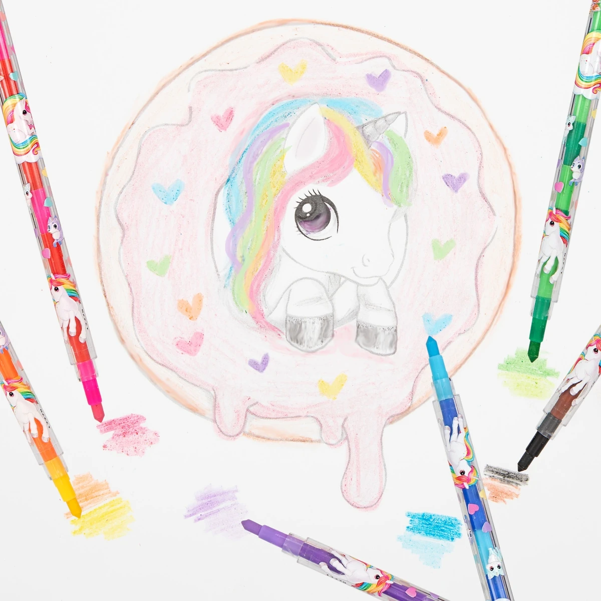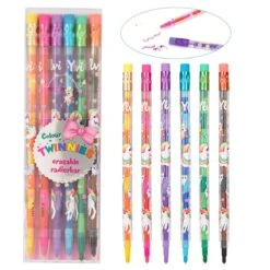 Jeder Ylvi-Steckbuntstift mit Radiertopper enthält abwechselnd zwei Farben zum Nachschieben: Gelb/Orange, Pink/Rot, Lila/Lavendel, Türkis/Blau, Grün/Hellgrün und Braun/Schwarz.
