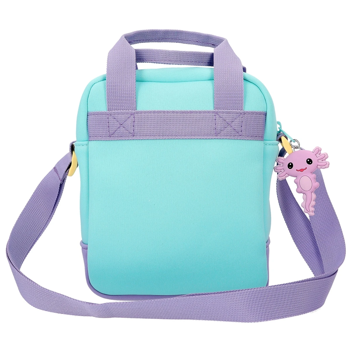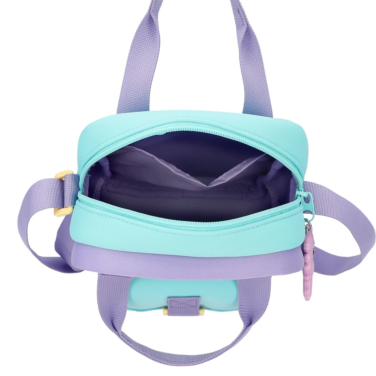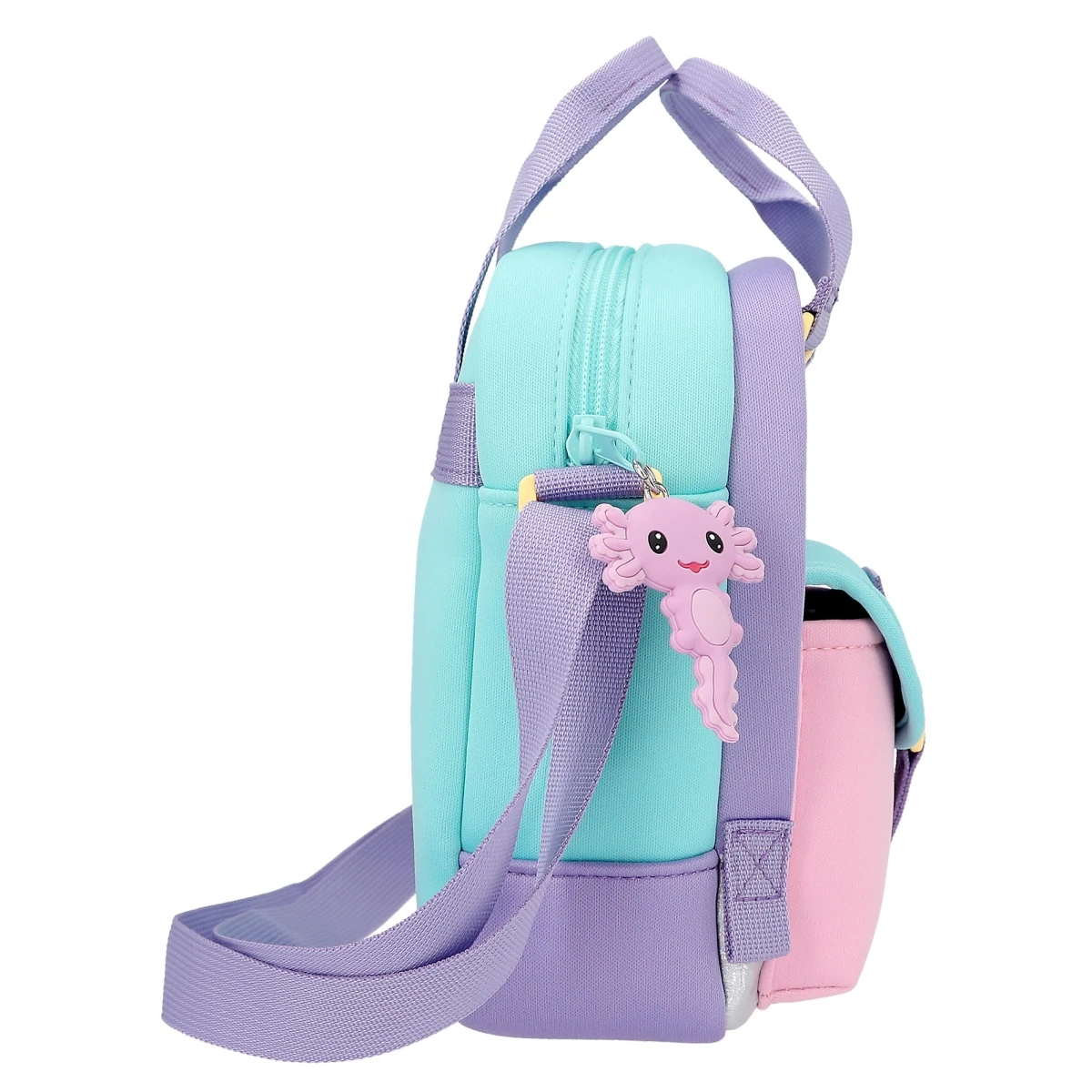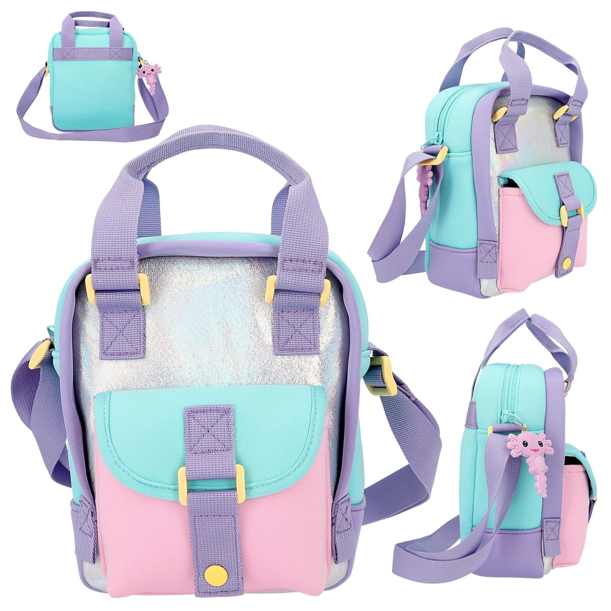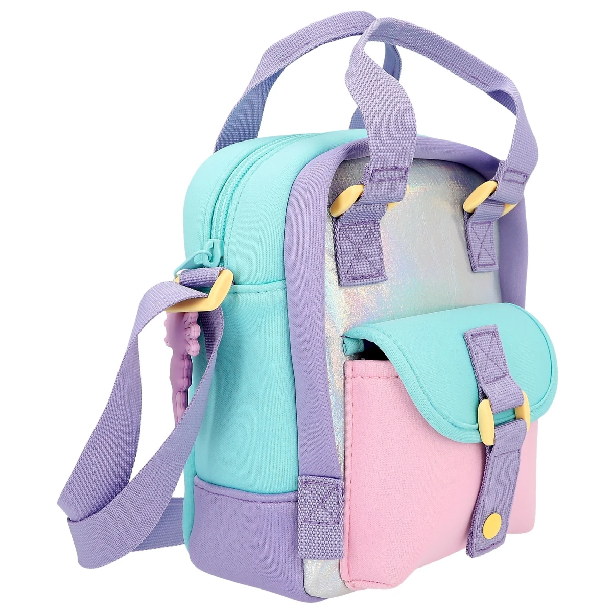 Die Umhängetasche in total angesagtem Colourblock aus griffigem Neopren in Pink, Lila und Türkis hat viele Innenfächer, einen Henkel sowie verstellbare Riemen.