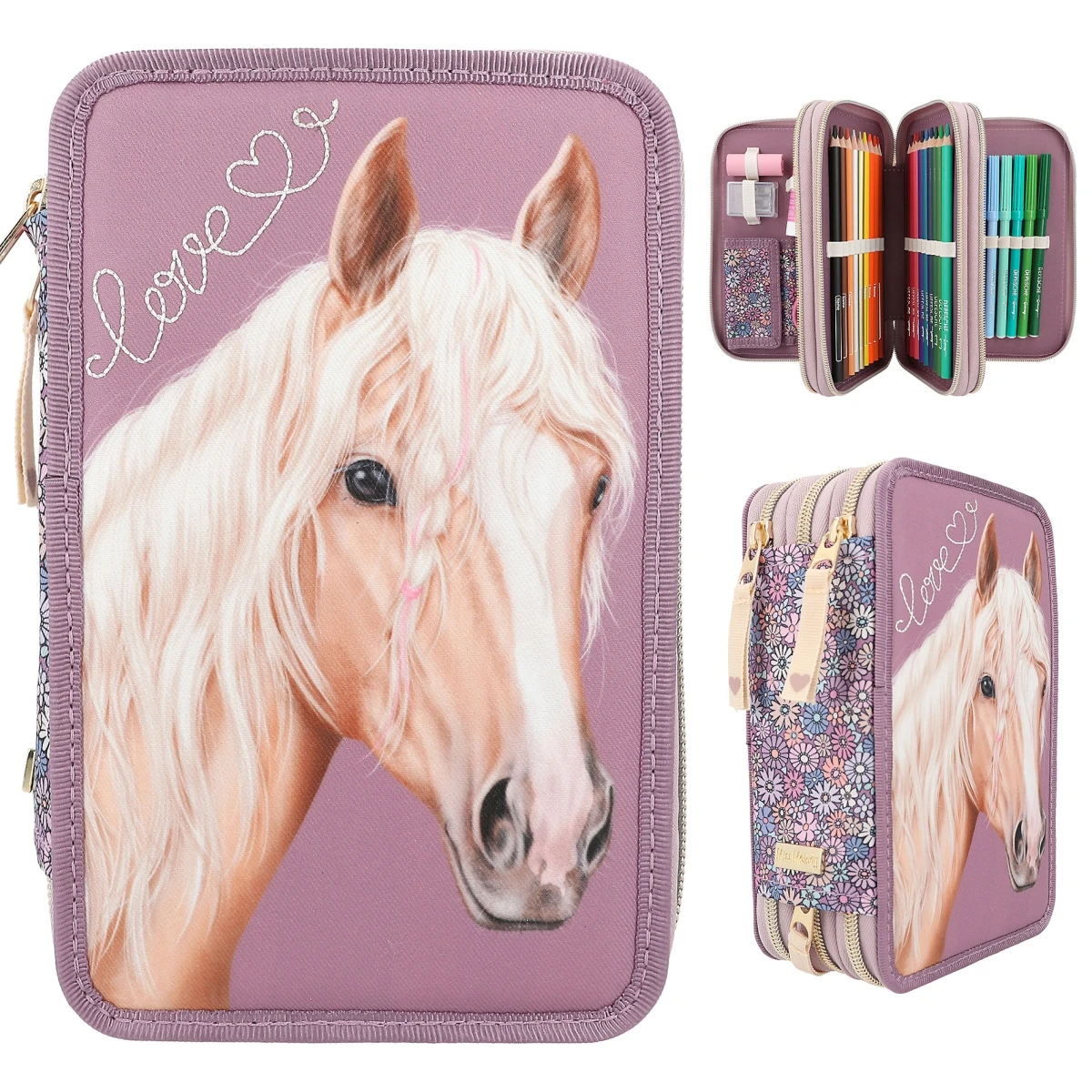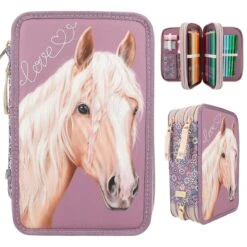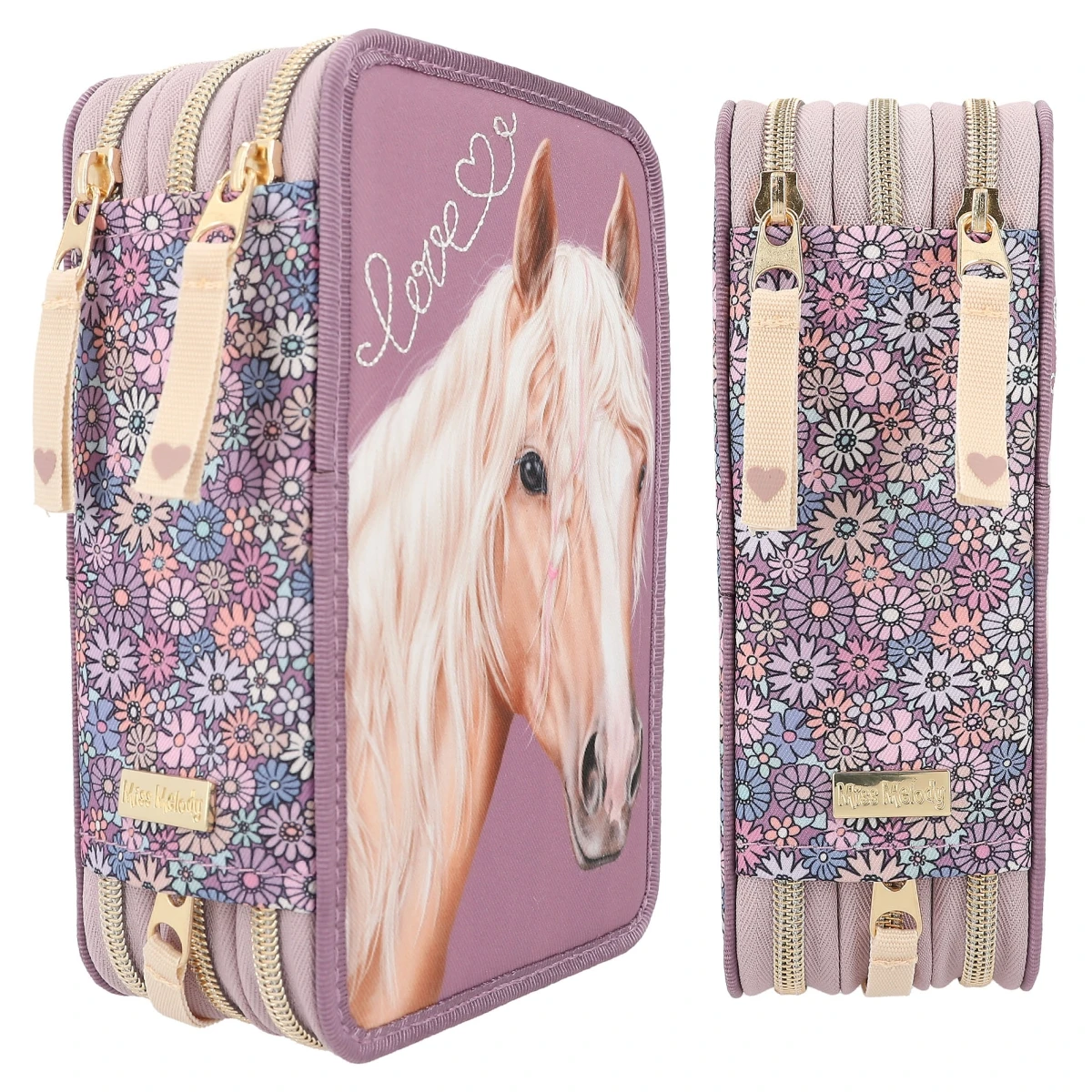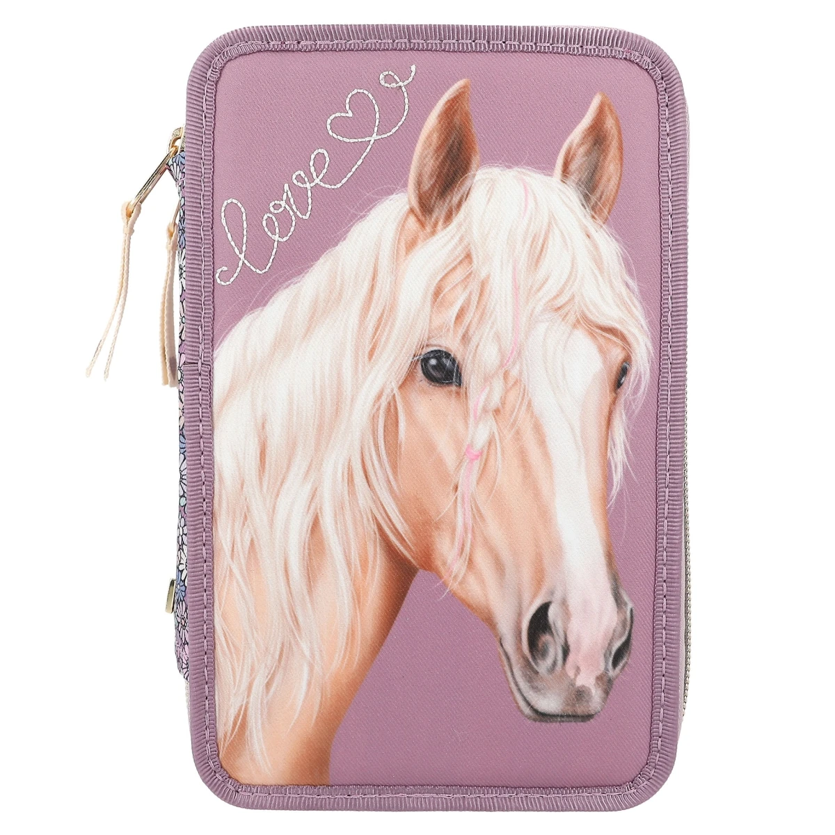 Die Federtasche von Miss Melody in rauchigem Lila hat einen wunderschönen Pferdekopf mit traumhafter Mähne sowie eine geschwungene Love-Stickerei auf der Front.