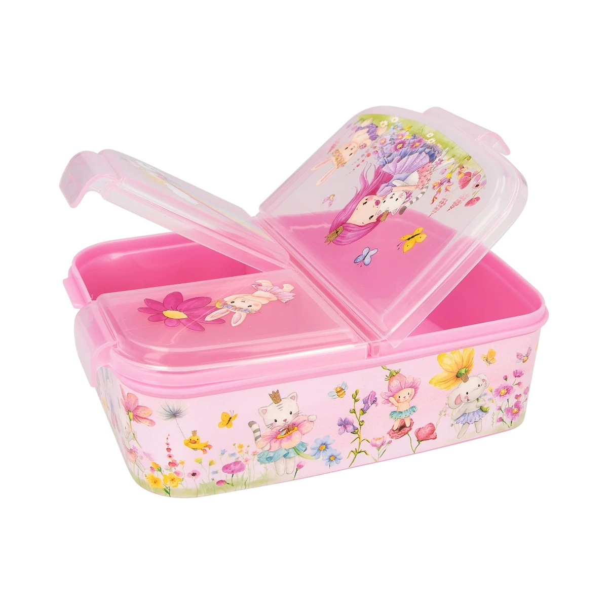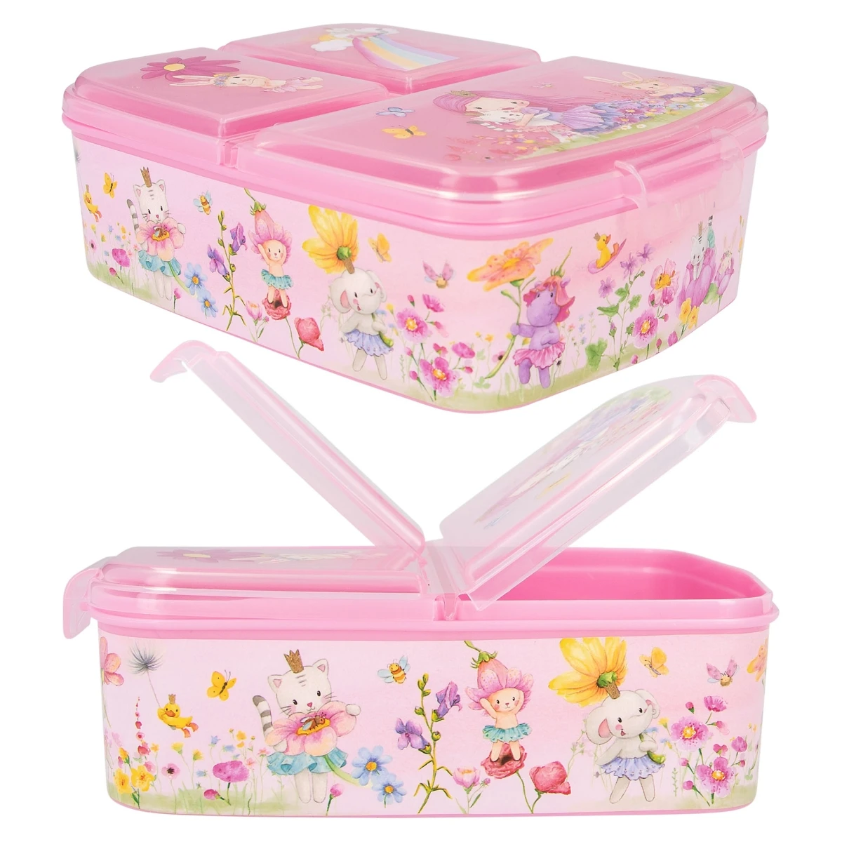 Die rosafarbene Brotdose von Princess Mimi hat drei separate Fächer (1 großes Fach, 2 kleine Fächer) mit praktischen Klipp-Verschlüssen in denen sich verschiedene Snacks nicht zu nahe kommen.