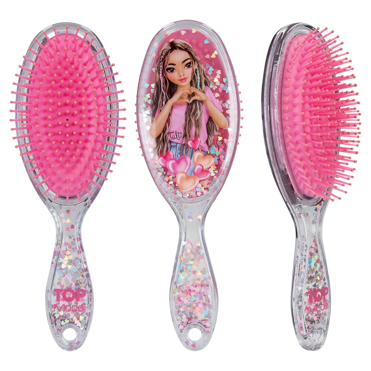 Konfetti-cool: Die transparenten TOPModel-Haarbürsten sind mit buntem Herzchen-Konfetti gefüllt, das sich bei Bewegung lustig hin- und herbewegt.
