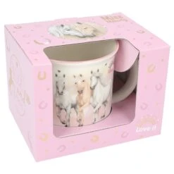 Der Porzellan-Becher von Miss Melody ist ein echter Pferde-Traum: sanfte Farben, edler Goldaufdruck, ein traumhaftes Pferde-Motiv und niedliche Hufeisen.