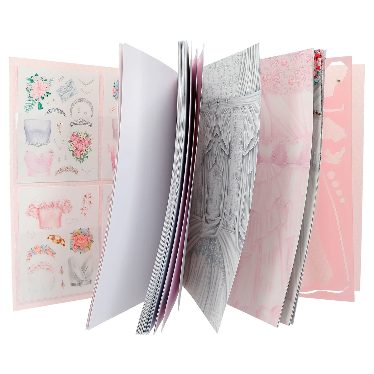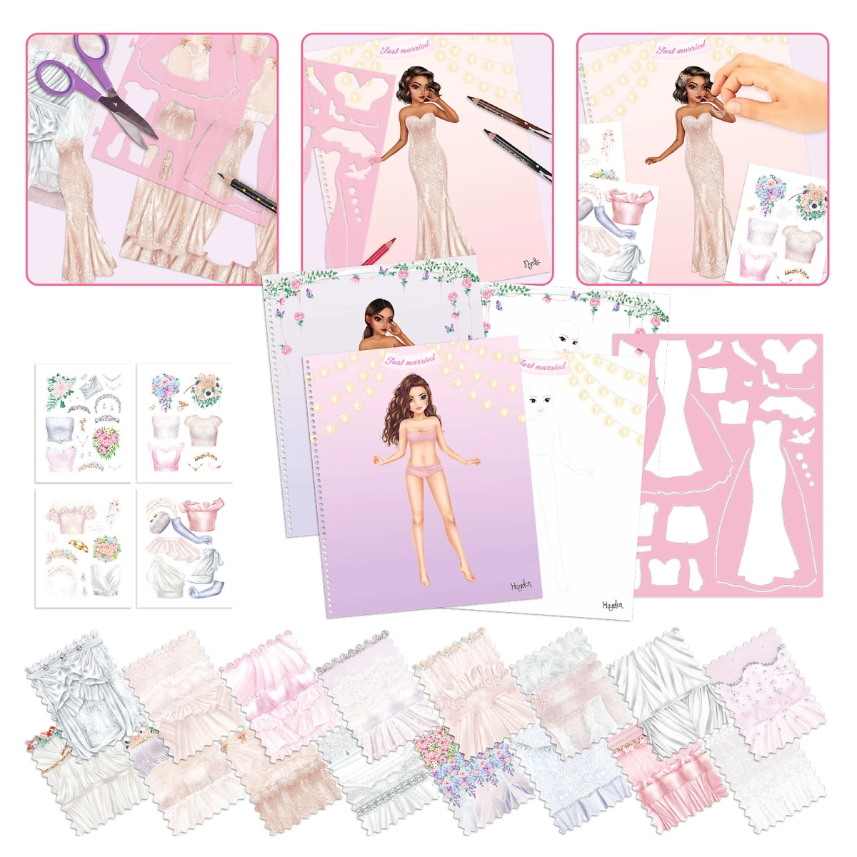 60 Seiten zum Gestalten von traumhaften Designs mit 4 Sticker-Bogen, 1 Schablone und 16 Seiten gedruckten Stoff-Optiken zum Ausschneiden.