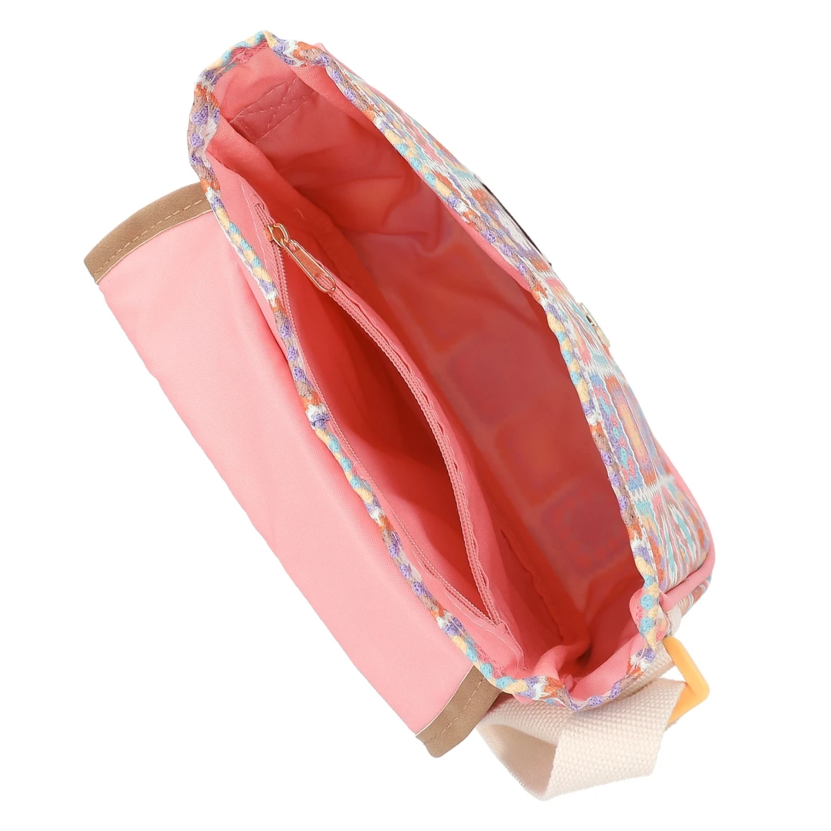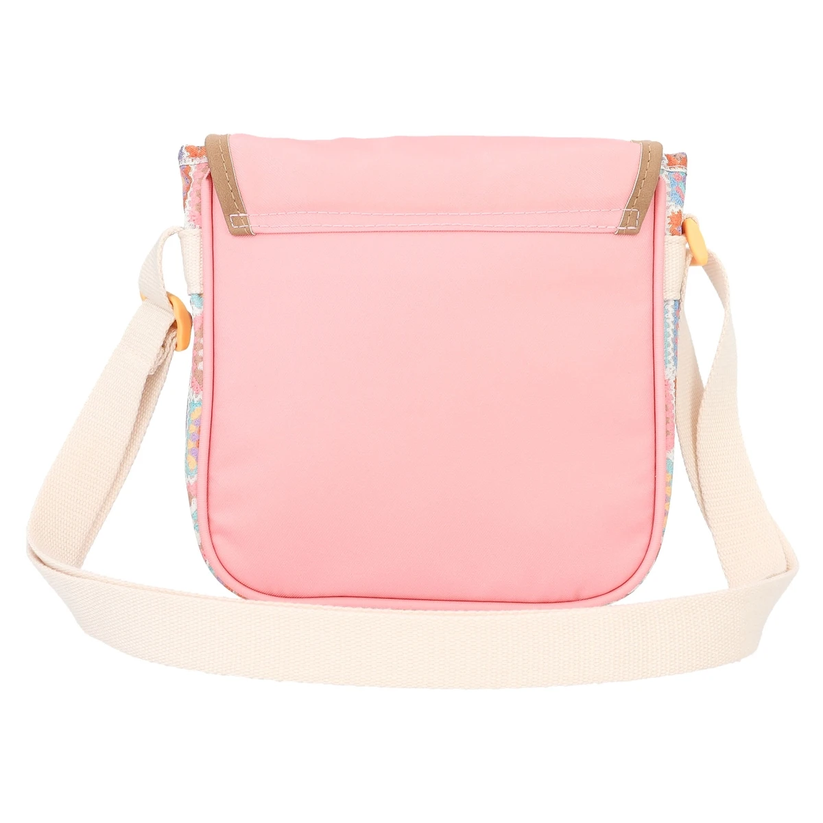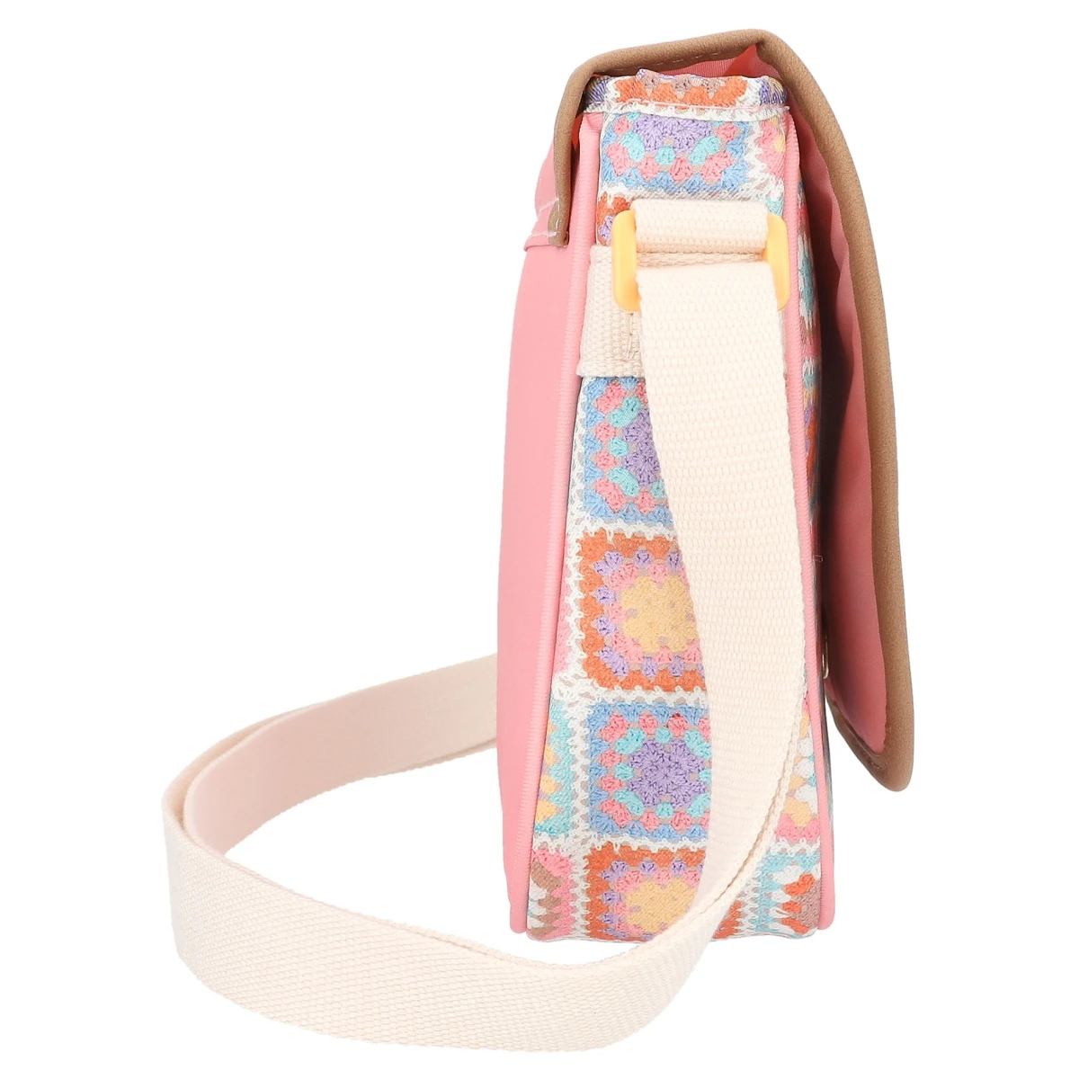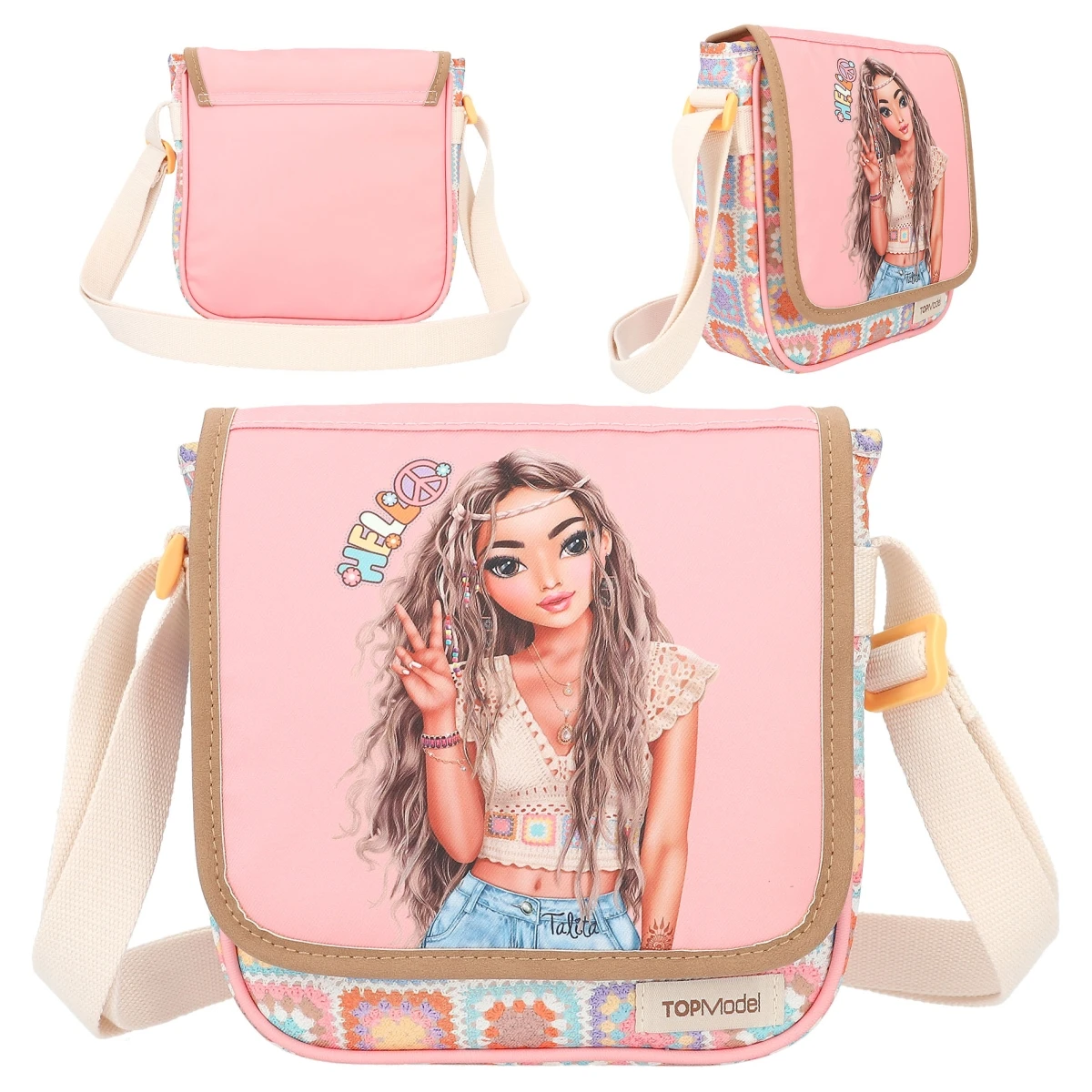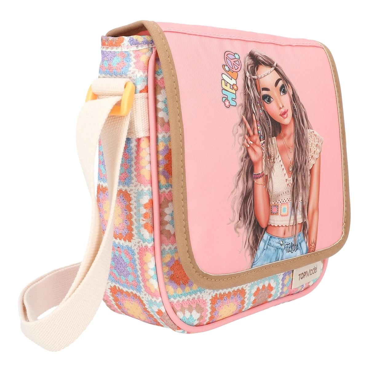 Die kleine Umhängetasche in sanften Pastell-Tönen hat auf der Front ein großes Hippie-Model-Motiv und darunter ein verspieltes Patchwork-Muster im Häkel-Look.