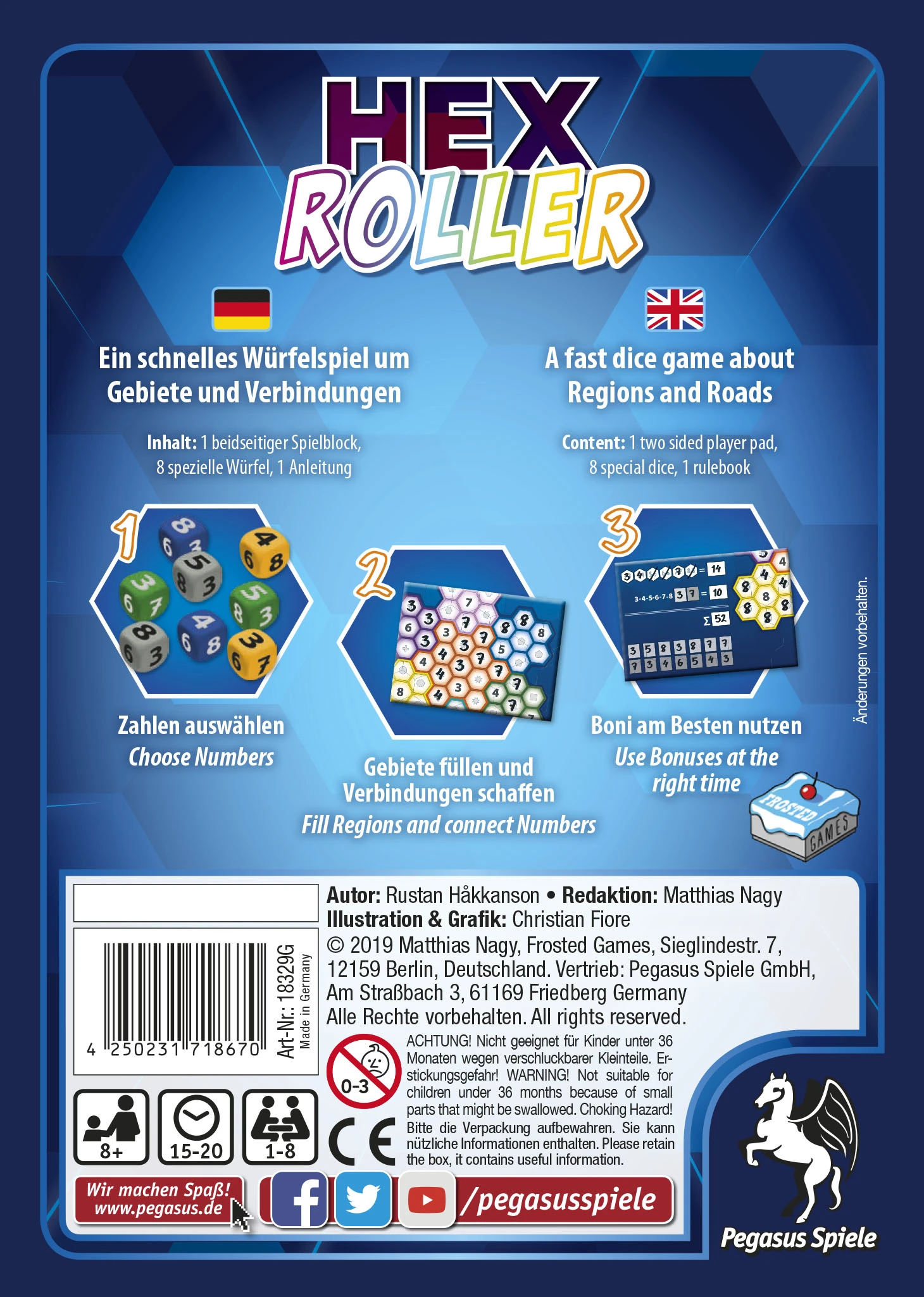 Mit einfachen Regeln und einem flotten Spielablauf ist HexRoller ein ideales Würfelspiel für Spieleleneulinge, bei dem alle immer aktiv sind. Durch die clevere Wertung kommen aber auch erfahrene Spieler auf ihre Kosten, die versuchen können, aus jeder Partie noch das letzte Pünktchen herauszuholen.