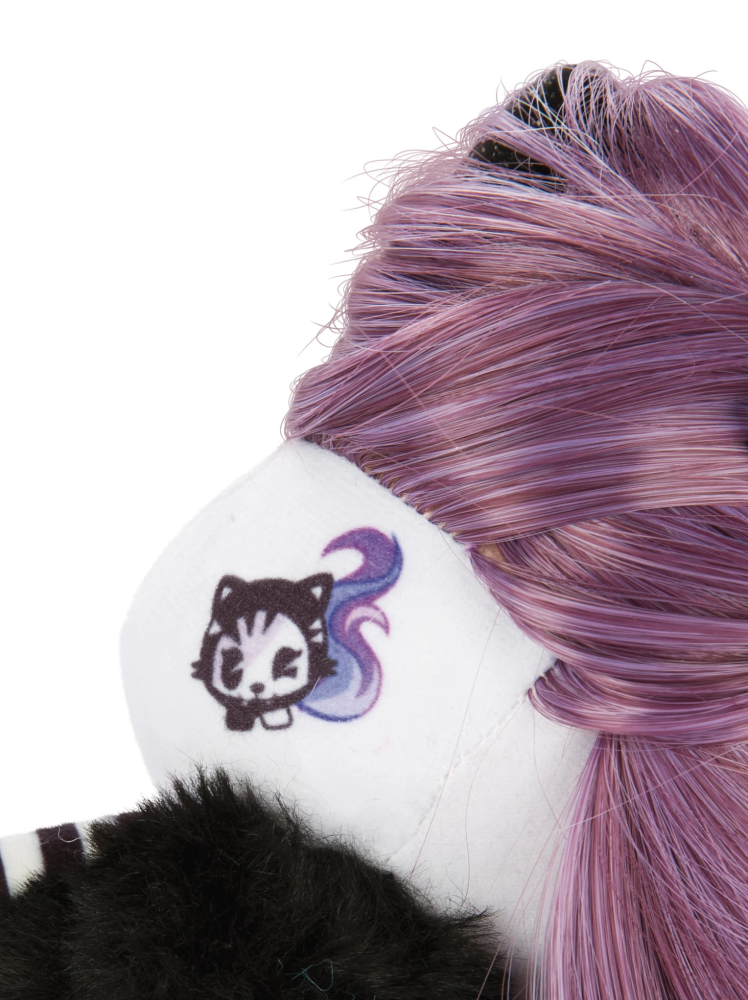 Zu der 20cm großen Puppe aus Plüsch mit den großen aufgestickten Augen, glitzernden Ohren und glitzernder Nase aus Kunststoff gibt es einen Kamm, passende Tattoos sowie ein Armbändchen.