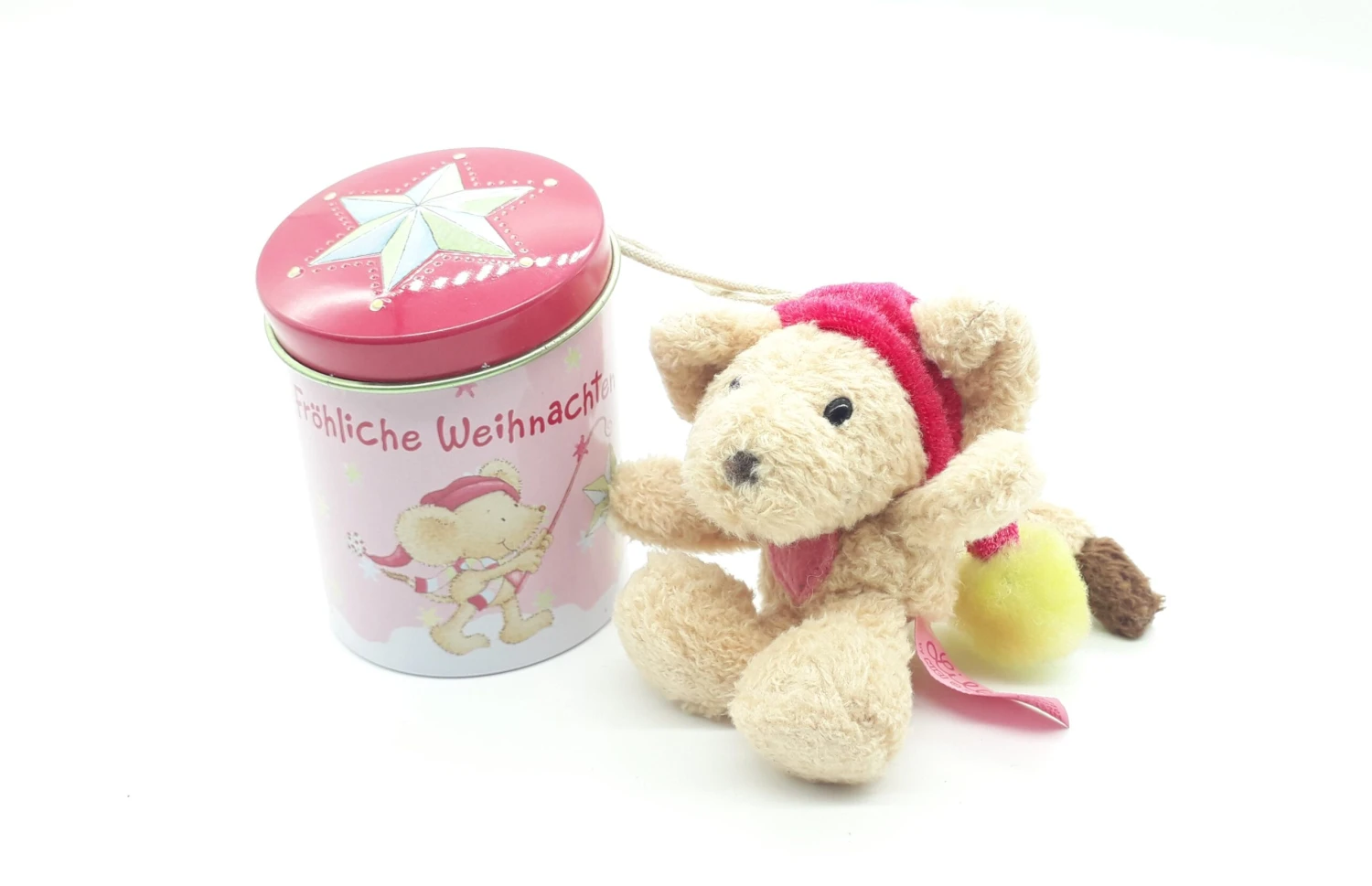 Kleine Maus mit Schlaufe am Kopf in kleiner Geschenkdose aus Metall
