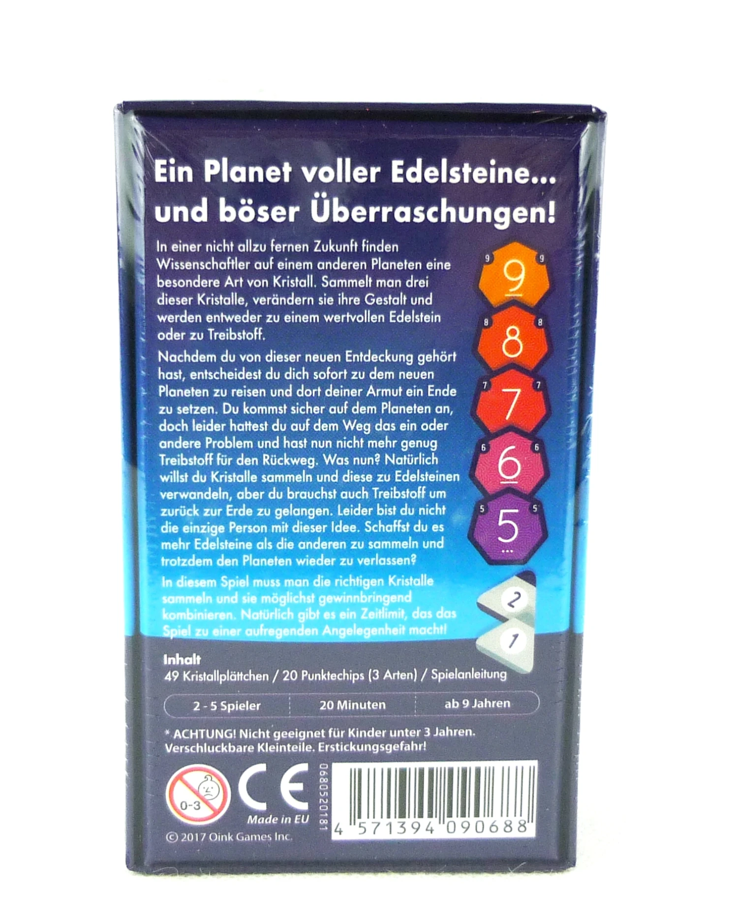 49 Kristallplättchen, 20 Punktechips (3 Arten), Spielanleitung