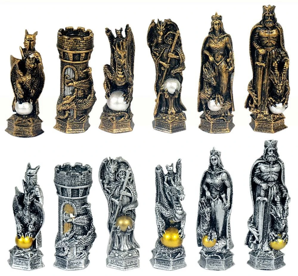 Schachspiel Ritter und Drachen in Gold- und Silberfarben